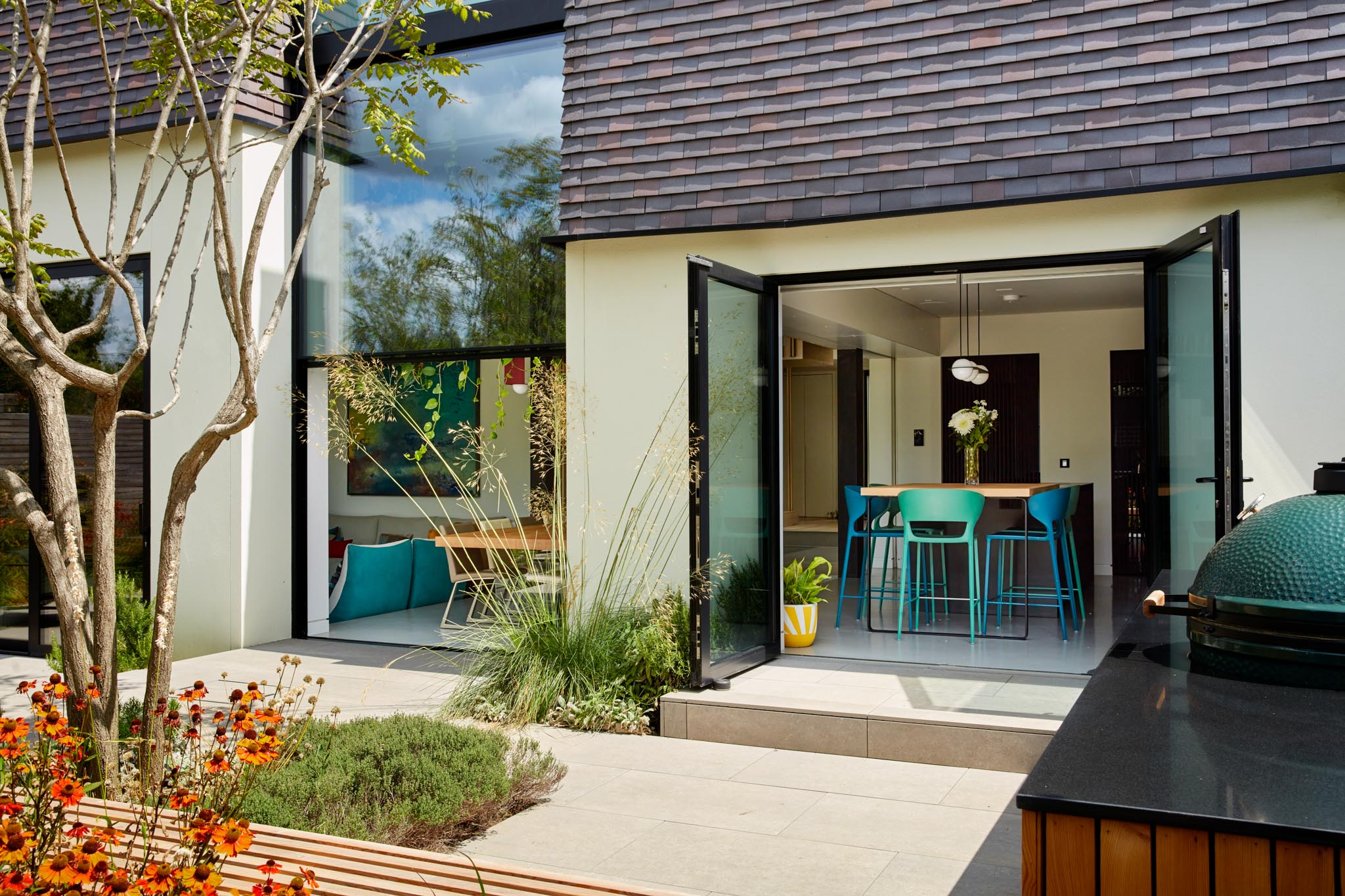 The timeless design seamlessly integrates with the outdoor environment and emphasises open-concept living. The spacious kitchen island is a central hub for the family and cultivates interaction and togetherness. Large, glazed doors create a fluid transition between the indoor and outdoor areas, enhancing the sense of space and connectivity. We chose high-quality materials and finishes for the bulthaup b3 kitchen, ensuring durability and aesthetic appeal, while intelligent storage solutions maximise functionality without compromising style. Our Rimadesio sliding doors stylishly divide the kitchen, pantry, and other living spaces. Focusing on the family's lifestyle needs and preferences enabled us to craft a versatile and inviting space that improves everyday living and creates a harmonious blend of interior architecture and indoor and outdoor living.