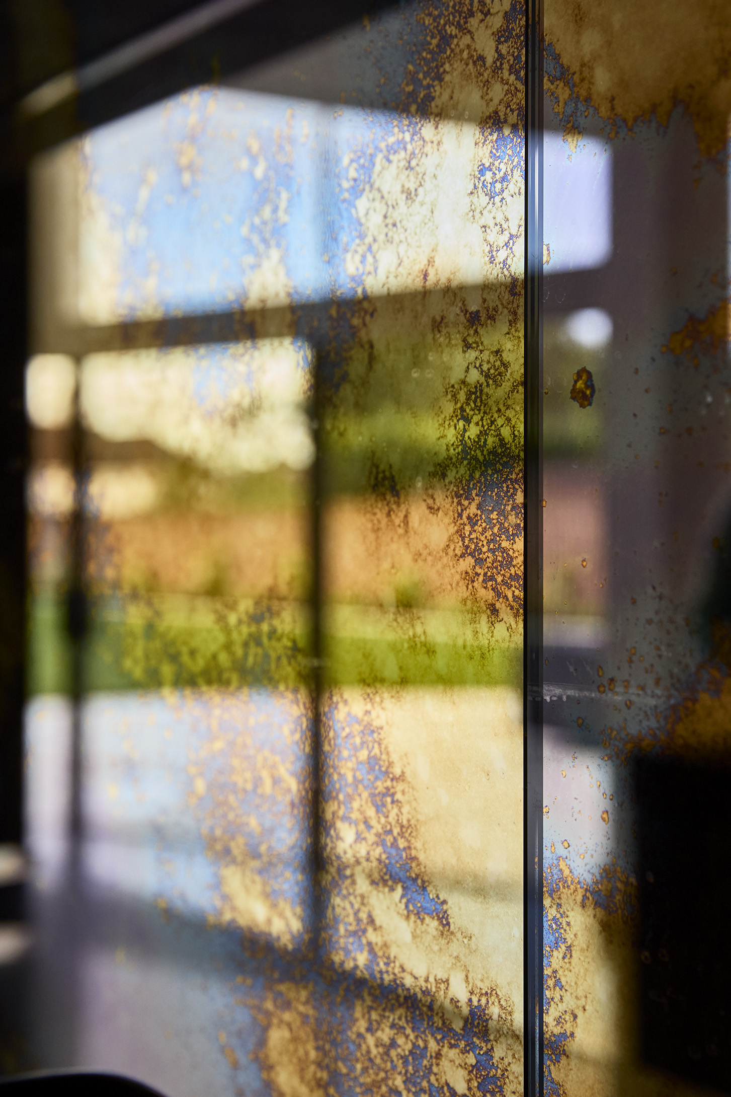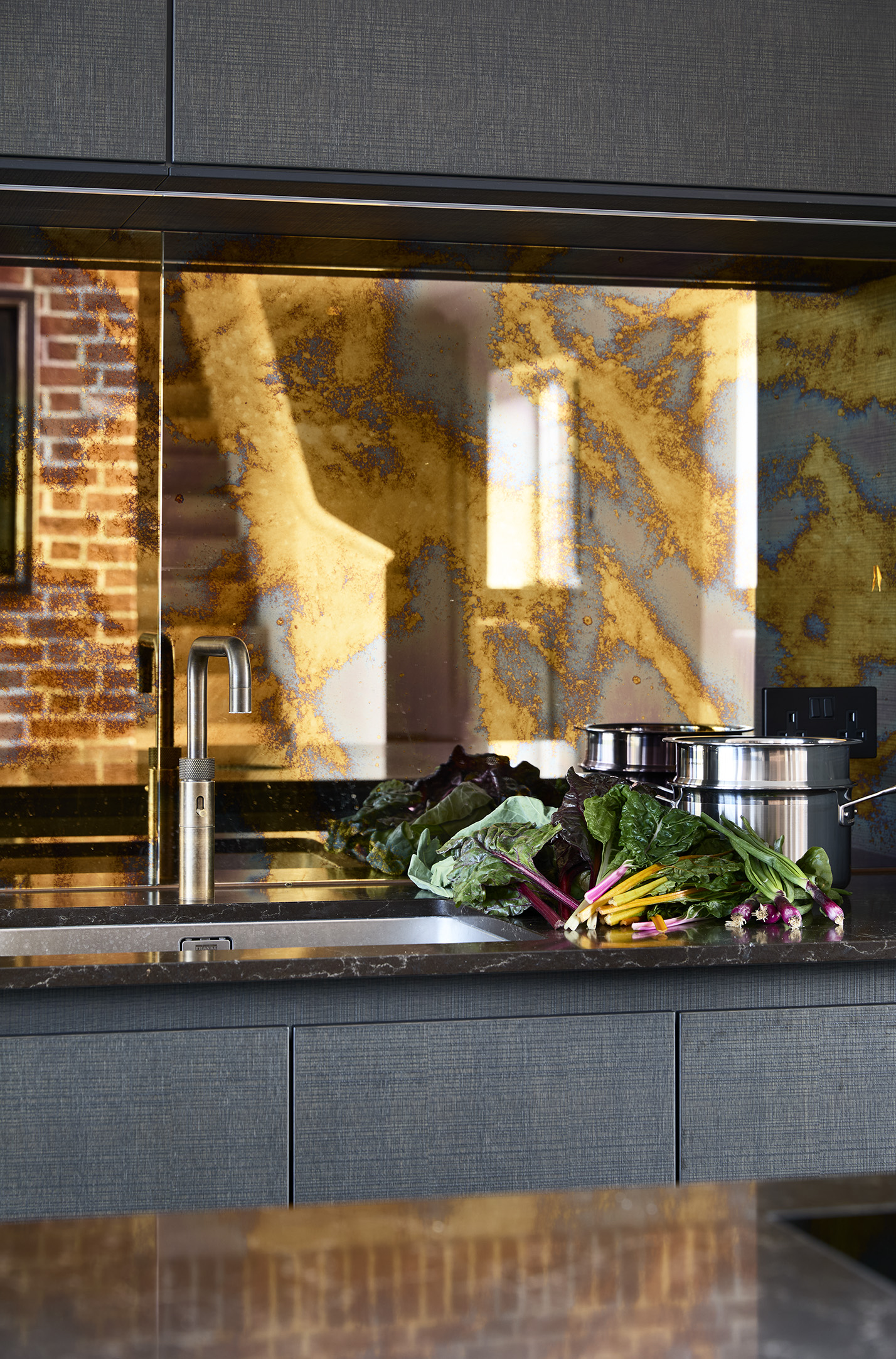 The black-brown structured oak cabinetry creates an atmospheric and refined feel, elevated by the golden undertone of the bespoke Burmese antique silvered mirror and anchored by the polished concrete flooring. The open-plan layout includes a tall block and a central island with a raised bar, which leads into a hidden pantry behind the main kitchen. Beyond the central kitchen is a bespoke wine room with soft seating that opens to the outdoor kitchen and garden. This is a perfect set-up for everyday life and year-round entertaining.