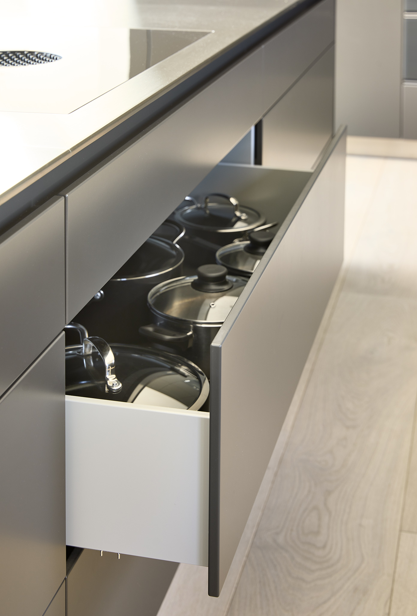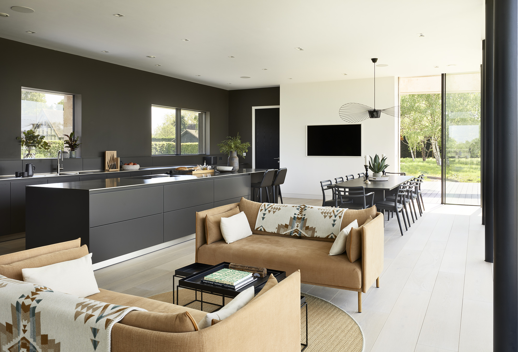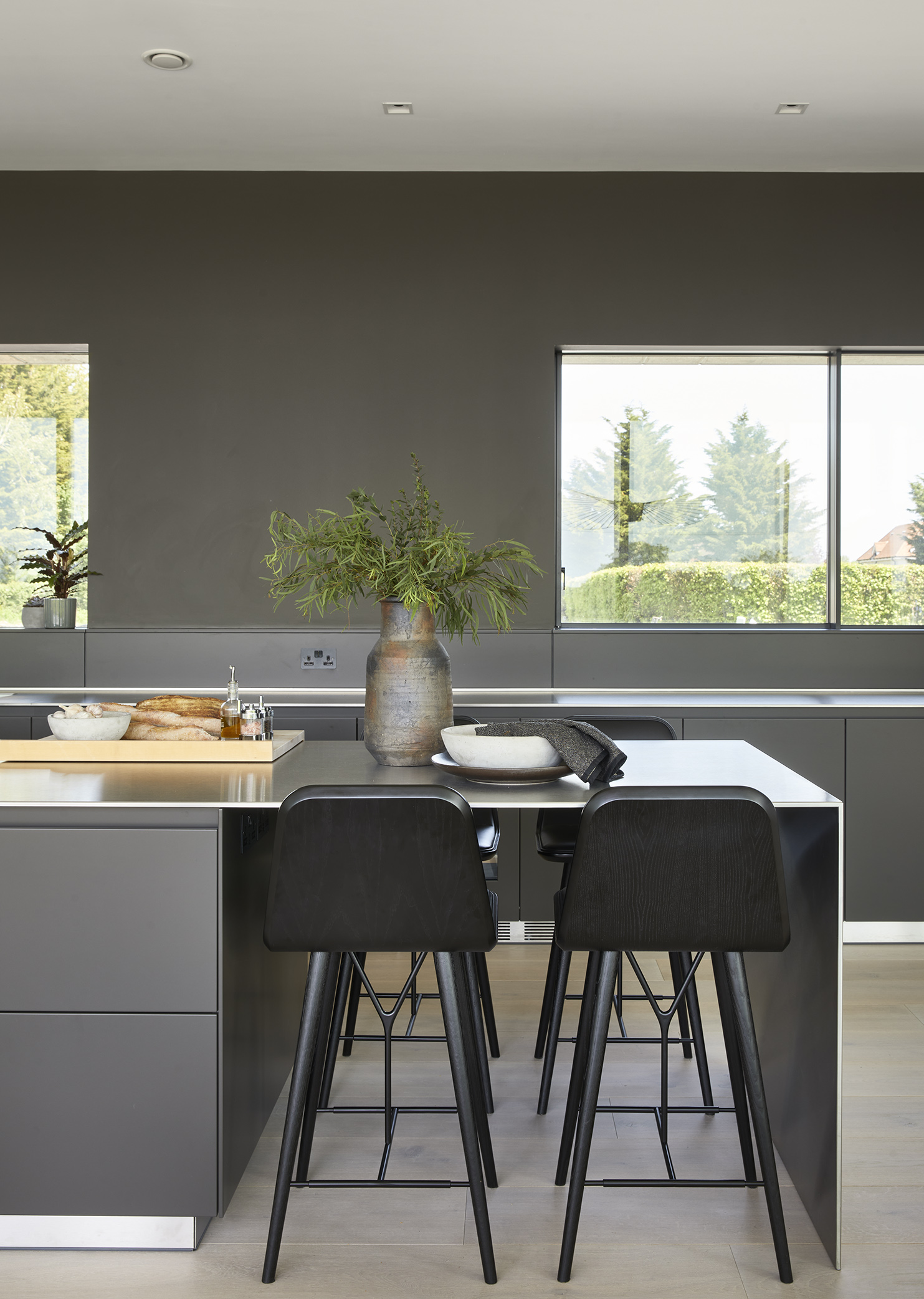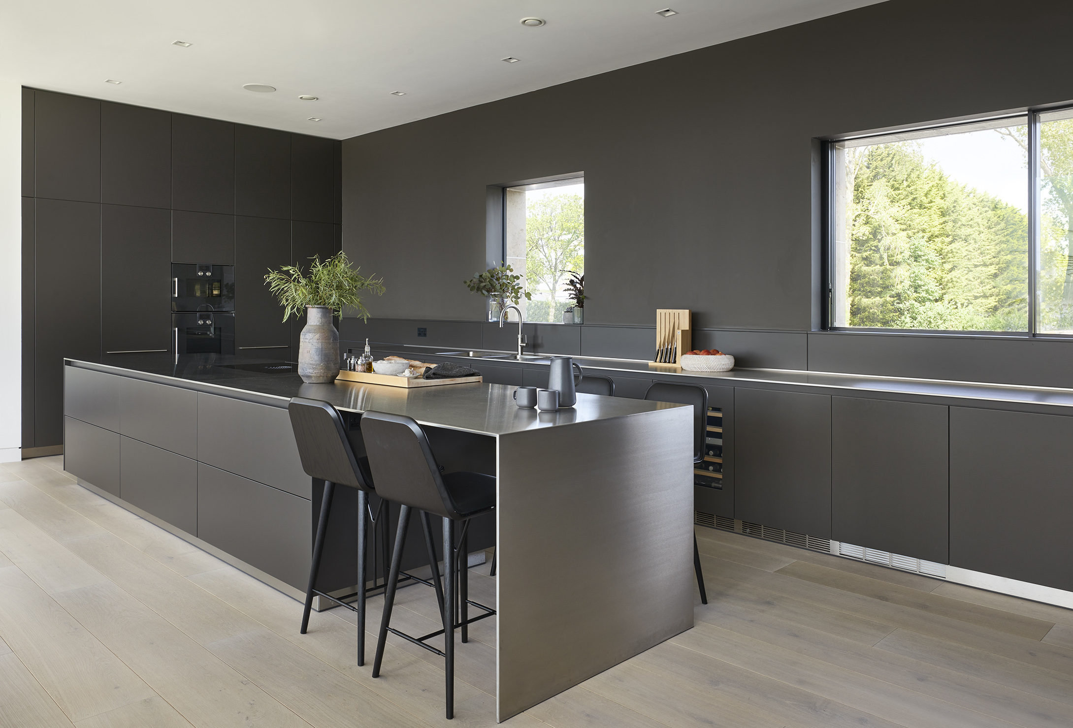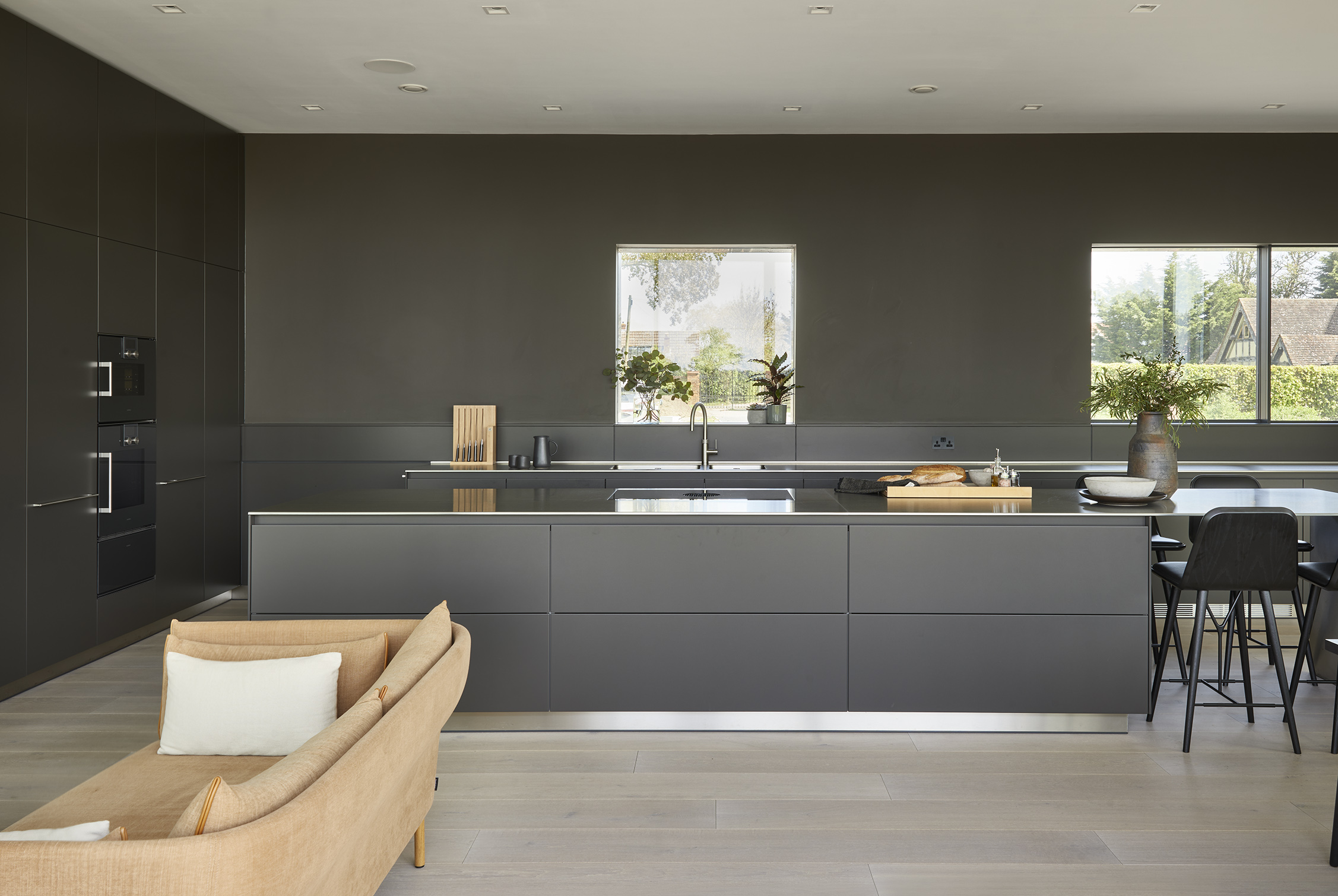 Presented in a Graphite lacquer with stainless steel work surface on the kitchen island. Recessed double height tall furniture featuring Gaggenau heating and cooling appliances. Sociable open plan living space connected seamlessly to the outdoors by large glazed sliding doors.