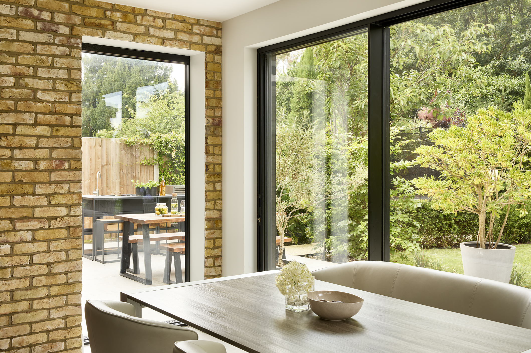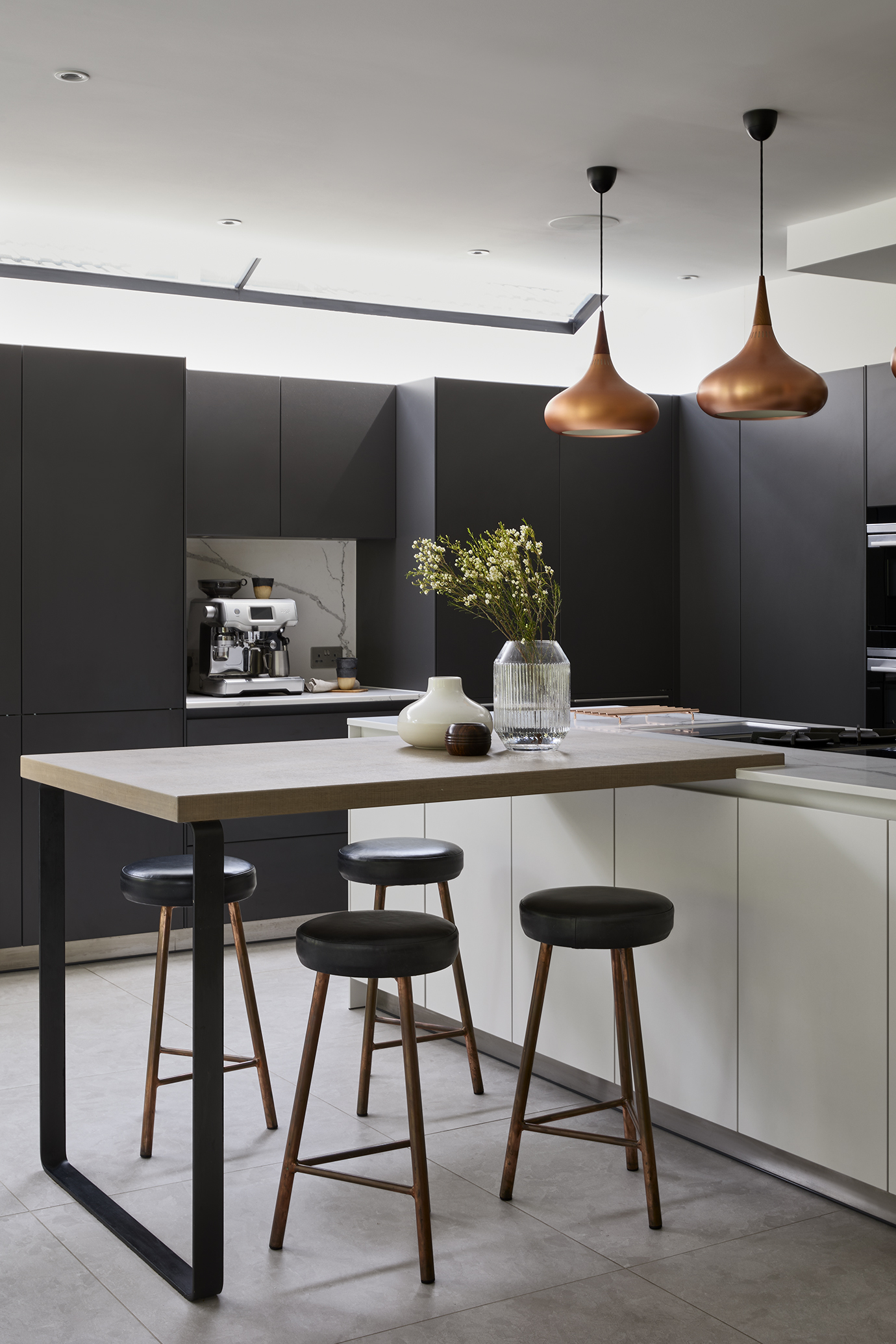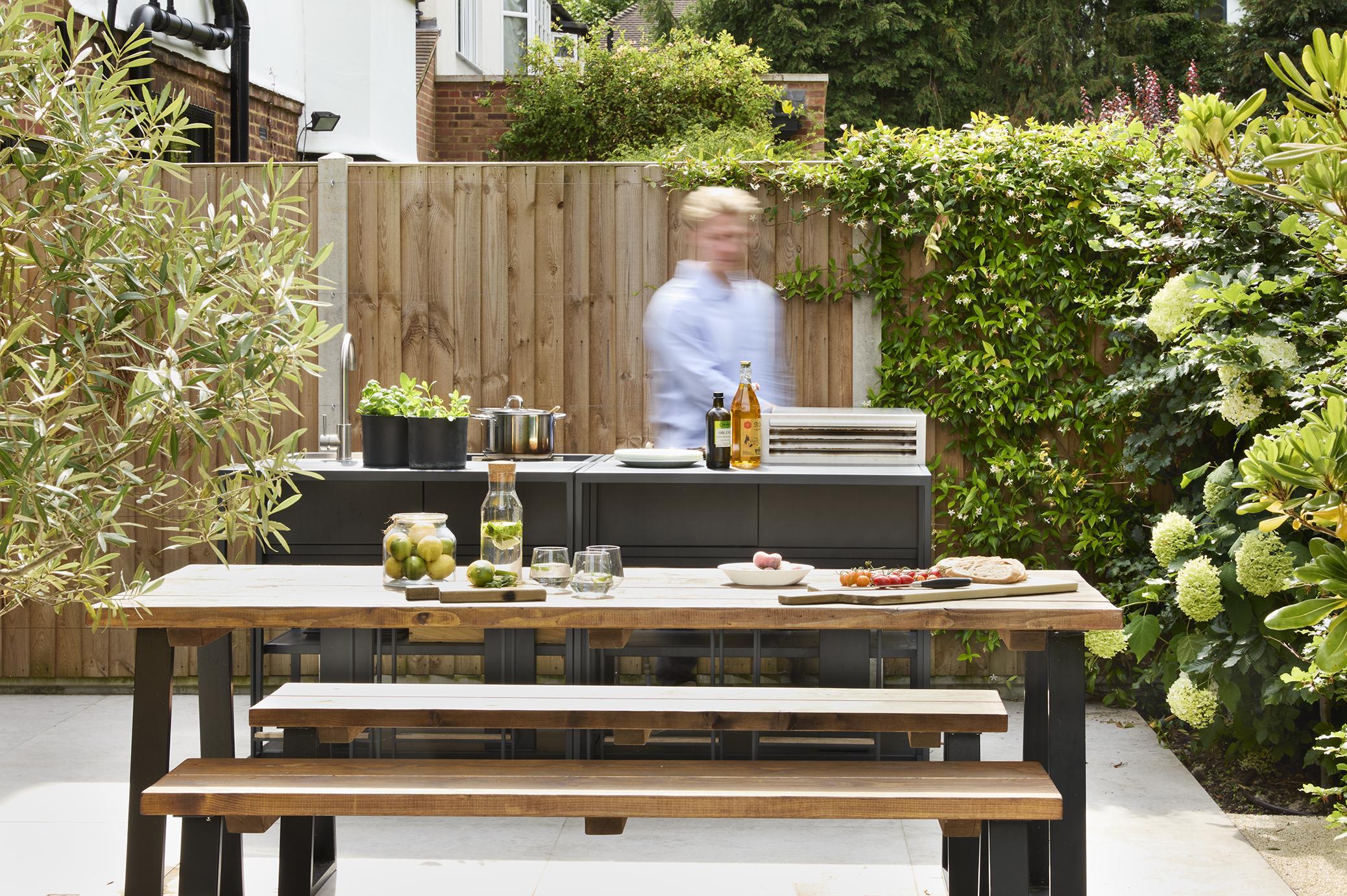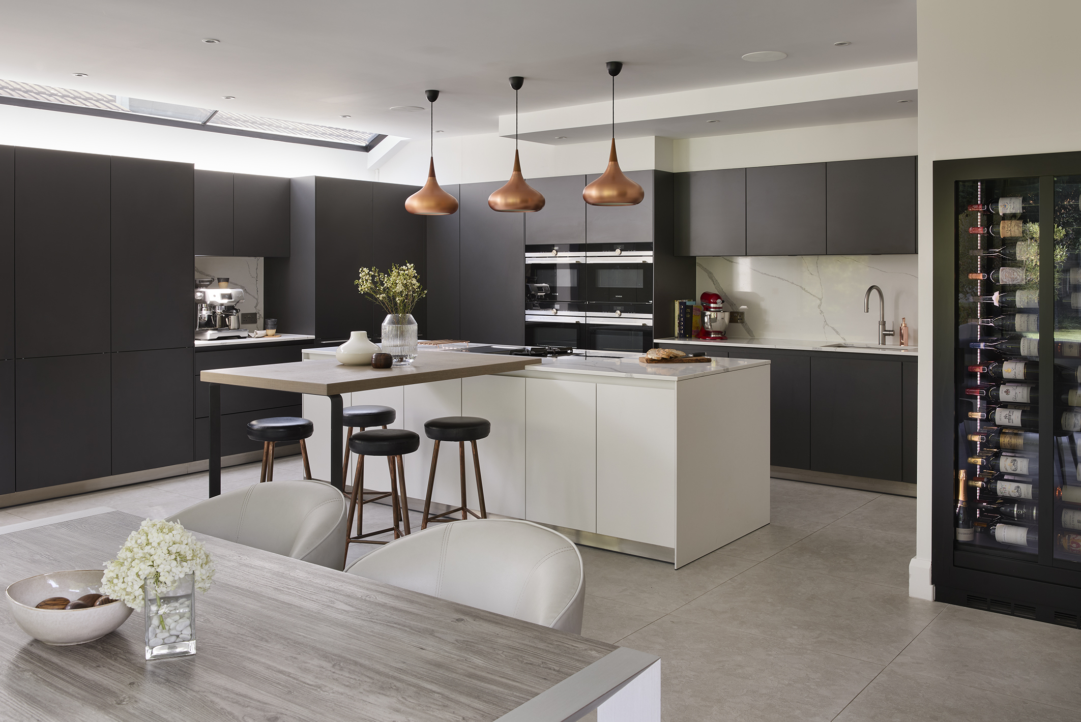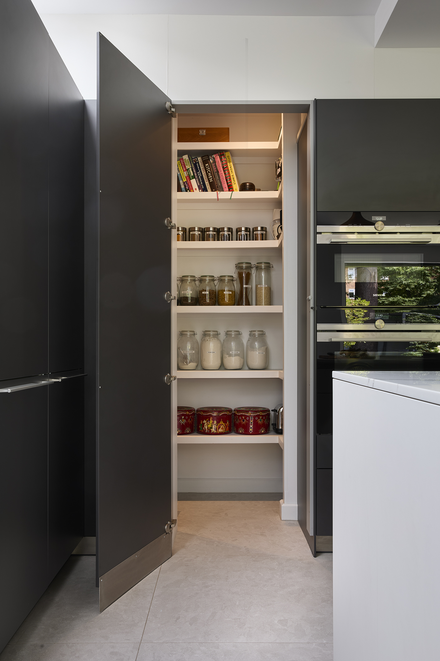 The island, with its view of the garden, enhances the owner’s cooking experience, while the mix of cooking surfaces (induction, gas, and teppanyaki) offers flexibility in cooking styles. With healthy balanced meals always a top priority for our wonderful client, the appliances being chosen were always going to play a crucial part in the final layout. Storage was a key consideration, so in addition to the large island, there is a hidden pantry, and vast work surfaces provide plenty of space to prep and serve. A raised bar provides a practical solution for everyday use beyond breakfast, and an outdoor kitchen creates a secondary cooking space that our clients enjoy using frequently, especially in the summer. The outdoor kitchen has a charcoal grill, gas grill, and gas hob to cook meals outside—ideal for family and entertaining. An adjoining bar and stools create a very sociable space. The space is a fine example of a designer and client working together to deliver a sociable kitchen living space that works for them.