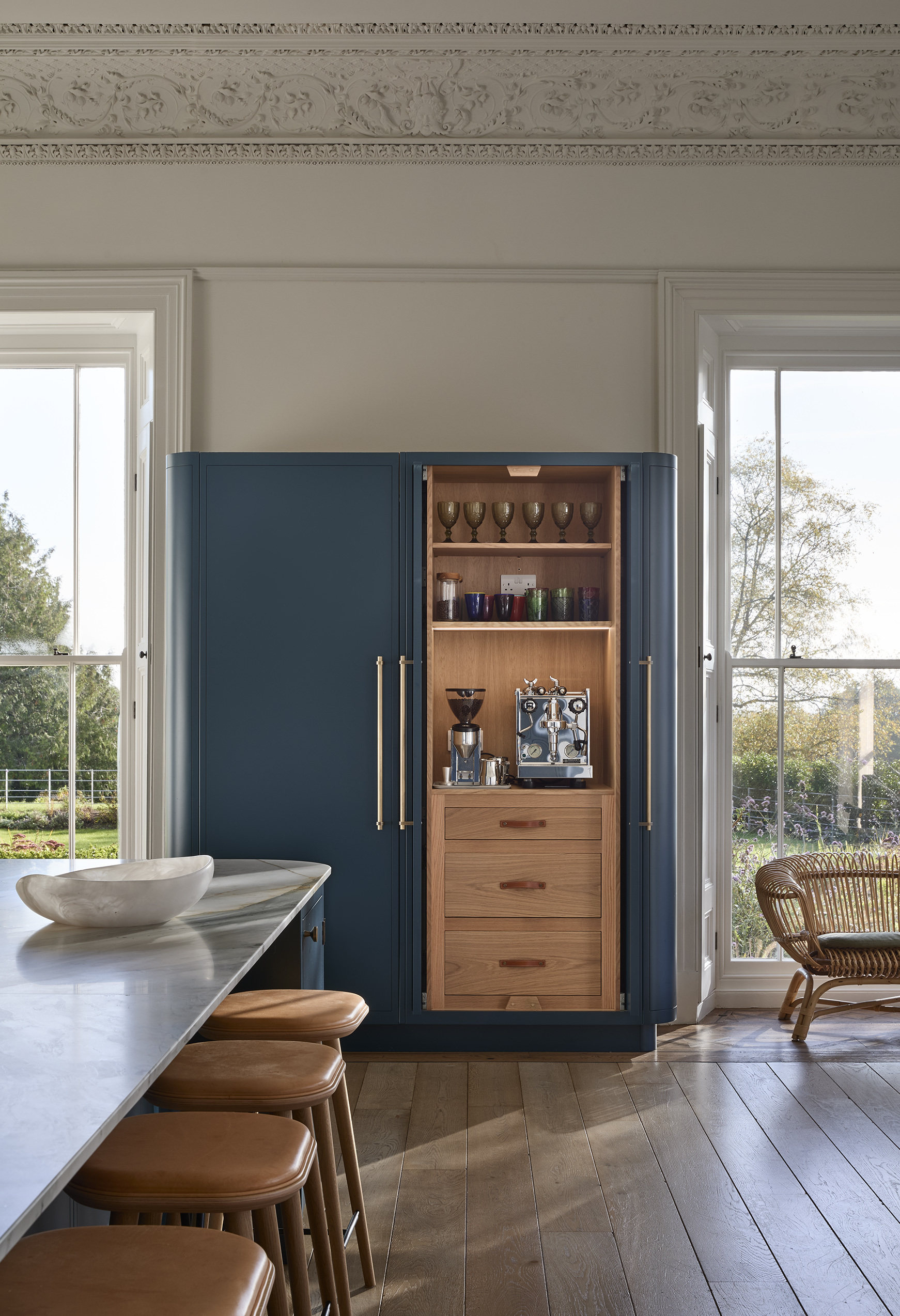 Now transformed into a modern family home that blends old with new in a seamless dance of design and functionality. The kitchen, handcrafted for a family that loves entertaining at home, features a show-stopping, custom-painted island with a marble work surface, ample storage, bar seating and state-of-the-art appliances, all designed for form, functionality and ease of use. Behind the island, a low wall run houses two impressive ovens with a shelf above, ideal for adding personal touches. The dining table is within easy reach, and a second ‘pantry and prep’ kitchen, in a striking shade of blue, creates a seamless cooking and entertaining experience. Working closely with architect Zoe Defert of London-based Zoe & Architects, we added bespoke touches, such as curved corners, to the furniture in the lovingly restored manor in a Somerset village. We also assisted and supplied the laundry room, the master wardrobes, the wine cellar, and an outdoor kitchen.