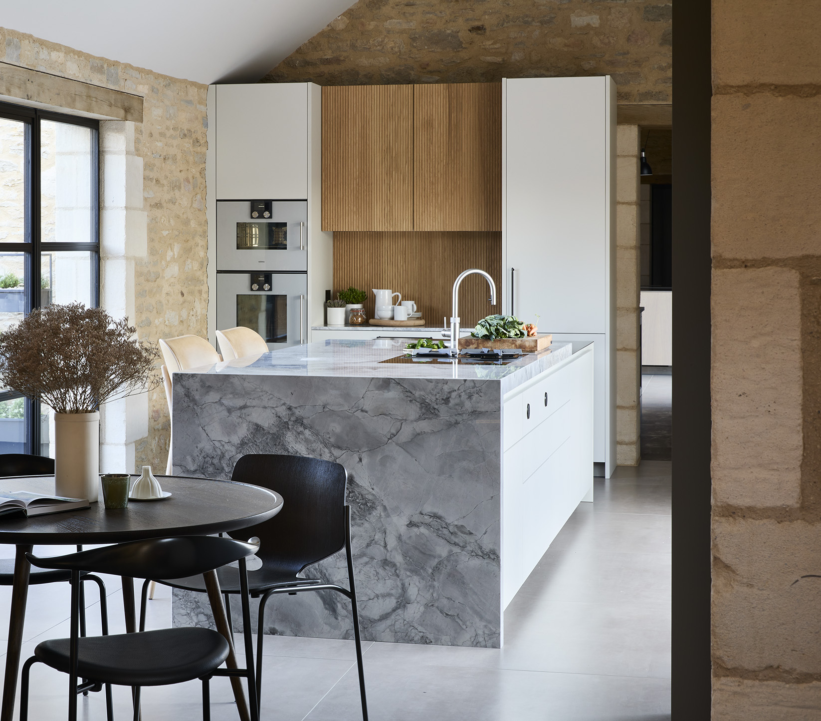 The mix of reeded oak wall units and stone finishes complement the natural palette and character of this personalised systemKA space.