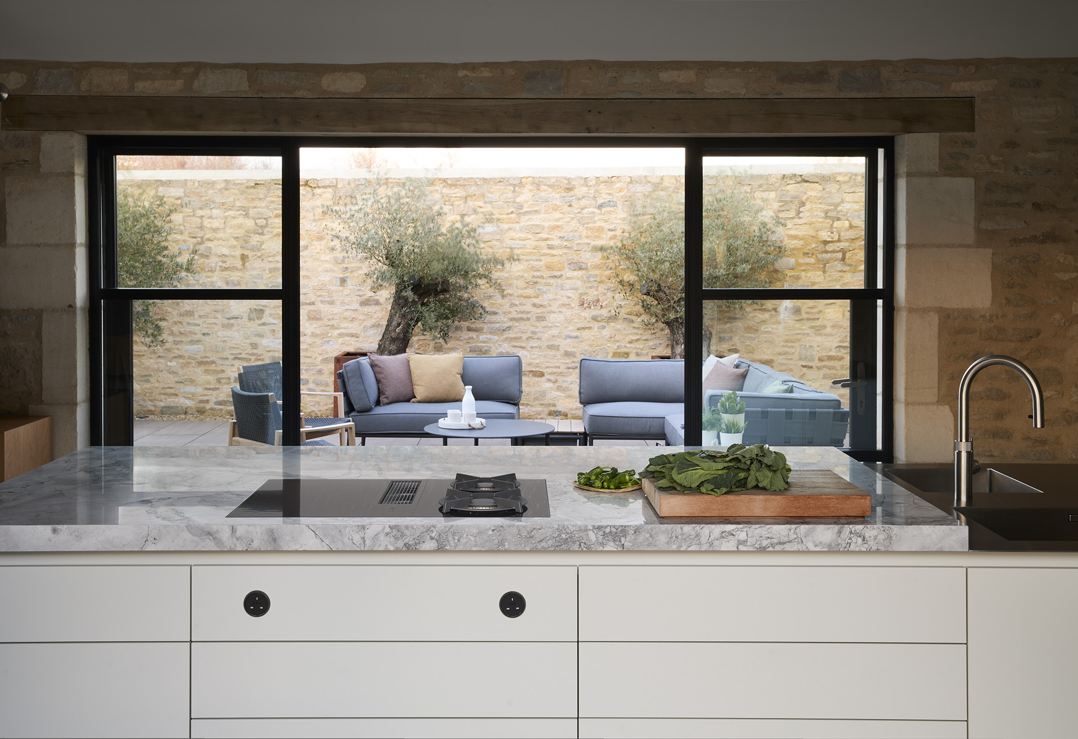 The layout of this sociable island in a narrow space has been designed to maximise garden views from both sides.