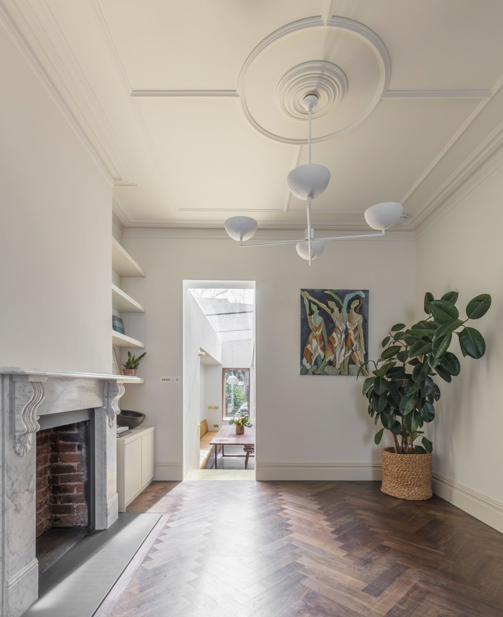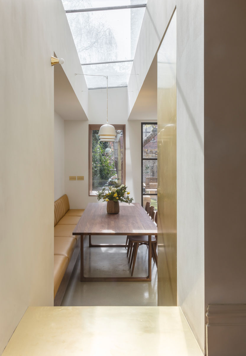 The sleek, timeless, and highly functional Bulthaup cabinetry makes a striking statement in the open-plan living area, elevated by its custom metallic brass finish. The extended space is bathed in natural light from varying angles throughout the day which brings the carefully curated palette of materials to life.