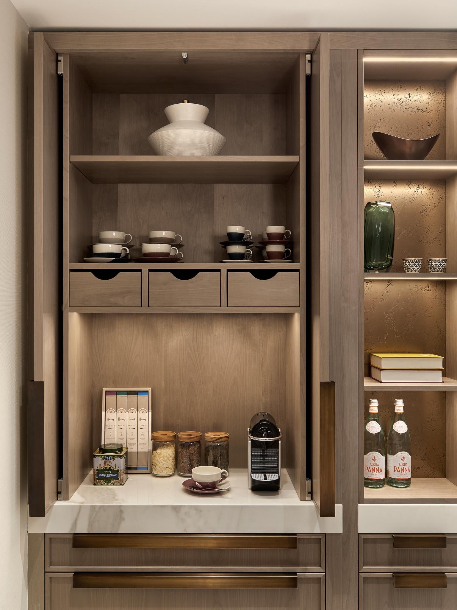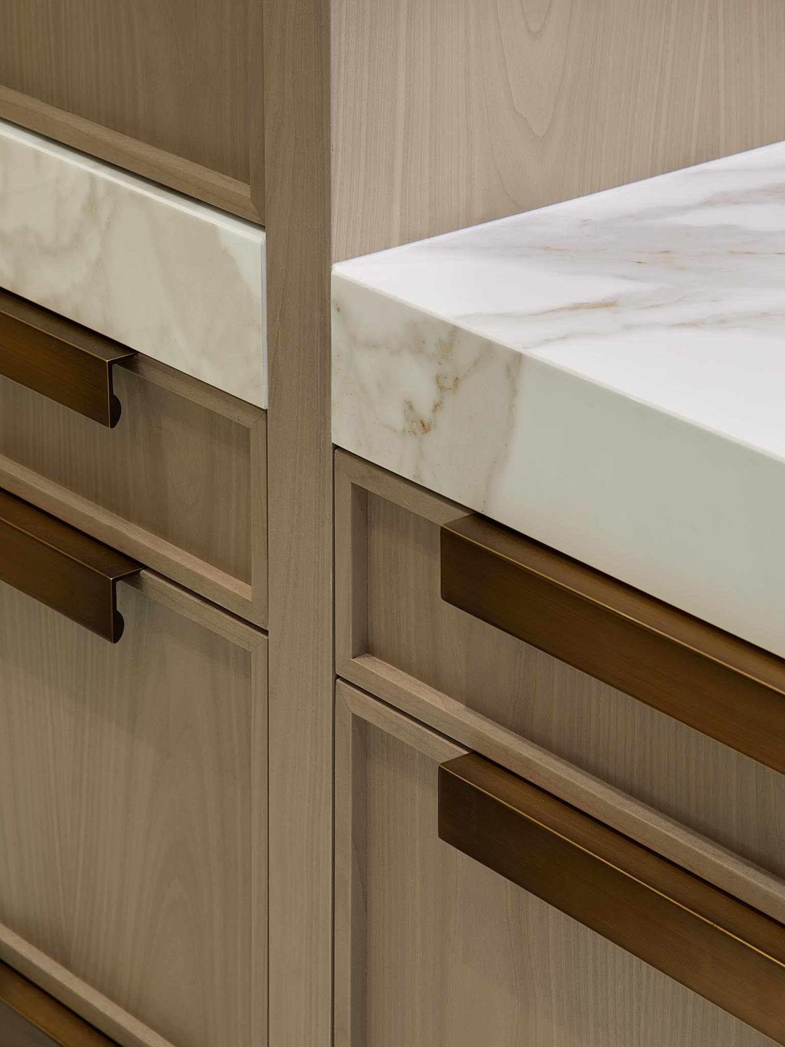 The focus was the quality in materials and functionality which resulted in the decision to use a luxurious stained birch on the units combined with aged brass handles form Joseph Giles and built up stone work surfaces. The flow of the space allows the cook to work between the hob and prep area whilst guests and family can still access the fridge for drinks and pocket door unit for coffee and refreshments. Teddy Edwards bespoke furniture with stained birch fronts, 90mm porcelain Estatuario polished work surface, and Joseph Giles 'Moon' brass handles.