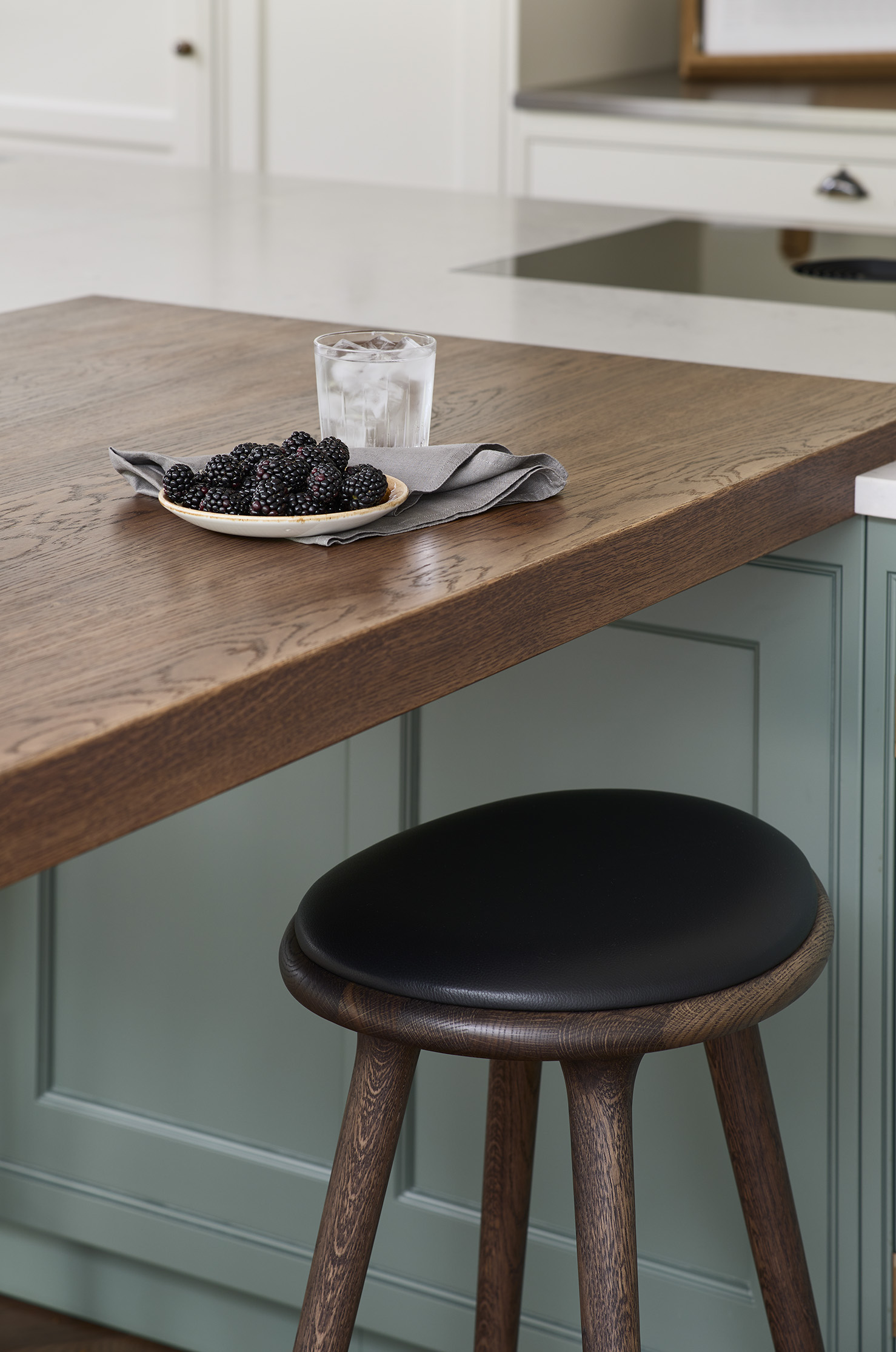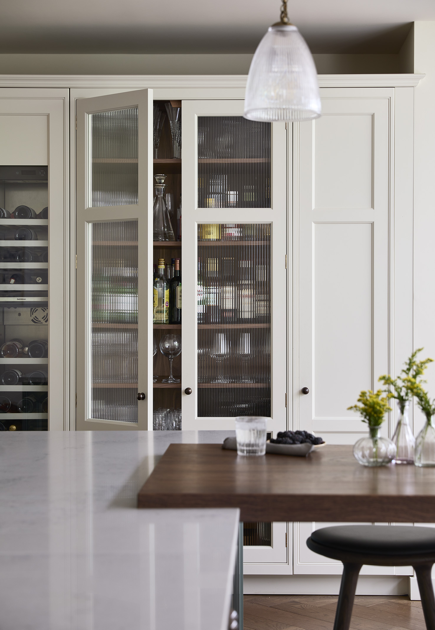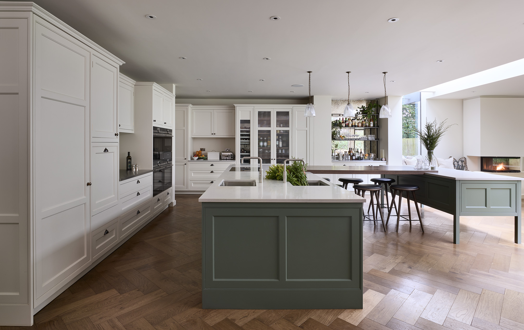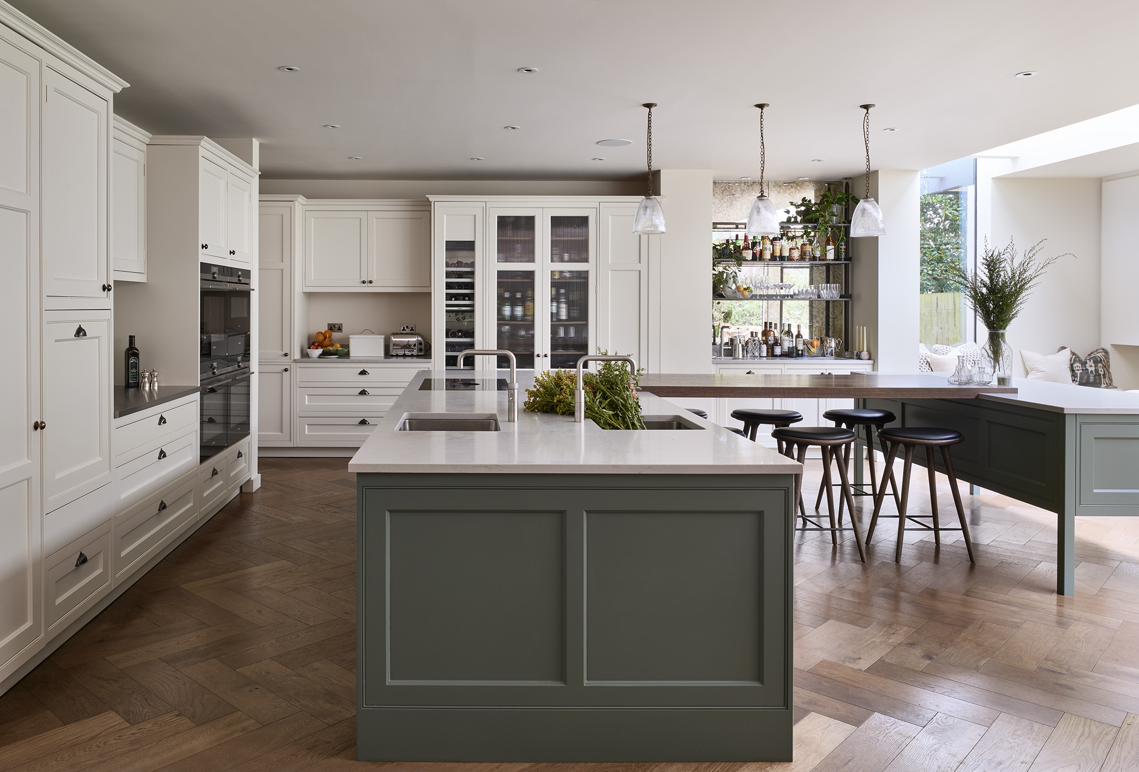 The location of the double island is the key to the integration of this multifunctional space and demonstrates how handcrafted cabinetry can be used for a modern lifestyle. The large bridging bar is perfect for family meals and connects the space to the home bar and dining areas.