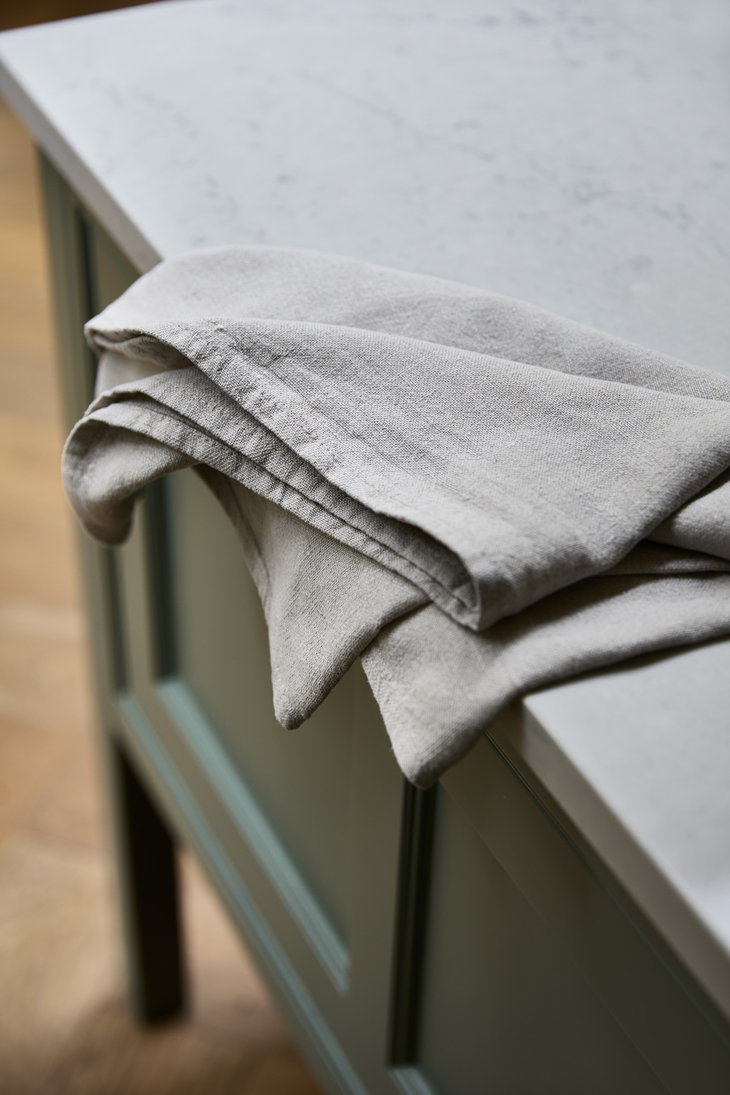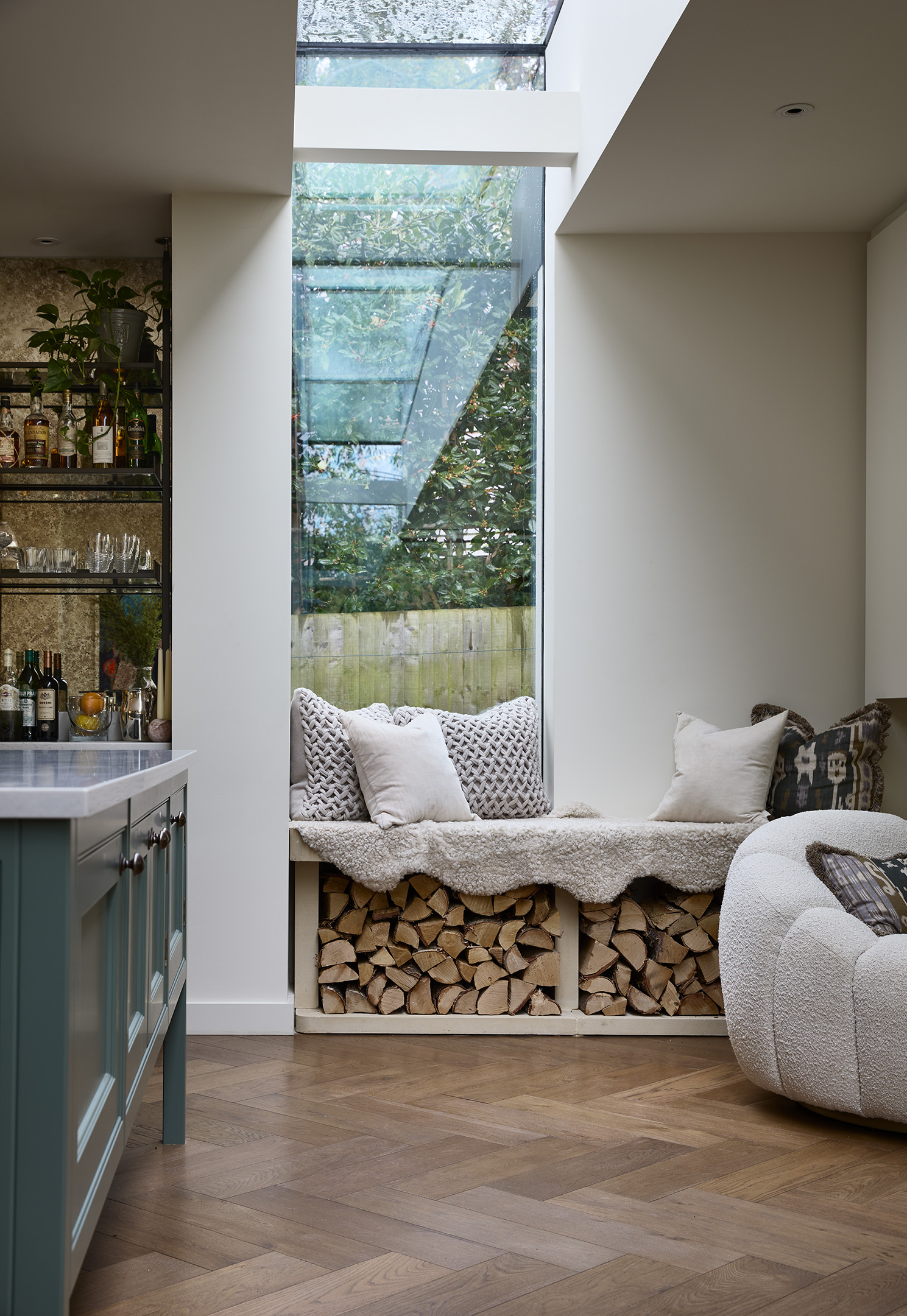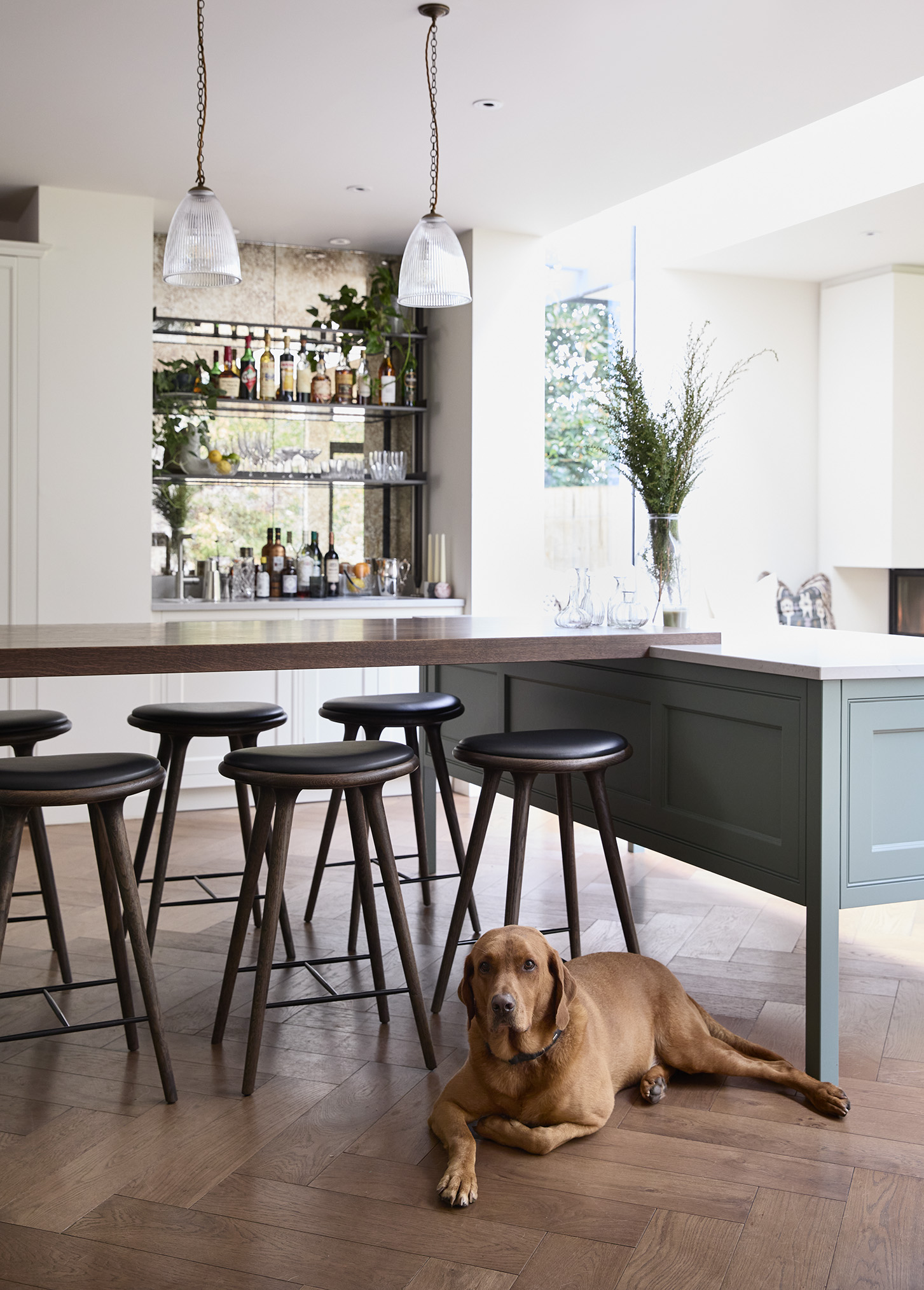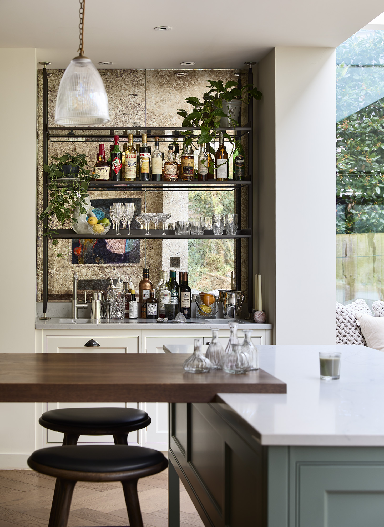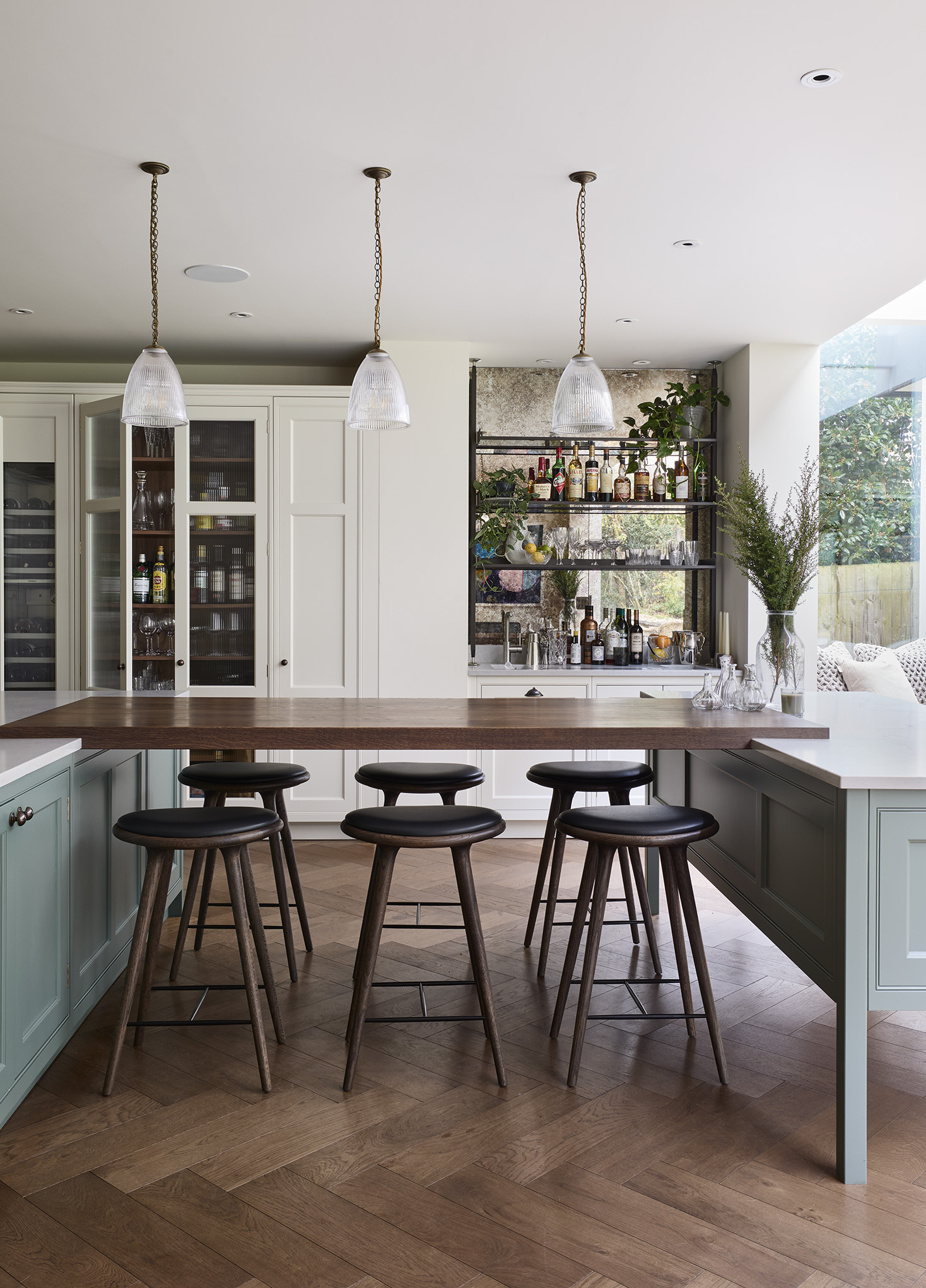 Kitchen Architecture’s Teddy Edwards furniture hand-painted in ammonite and green smoke with composite stone and stainless steel work surfaces, and Rimadesio Zenit shelving