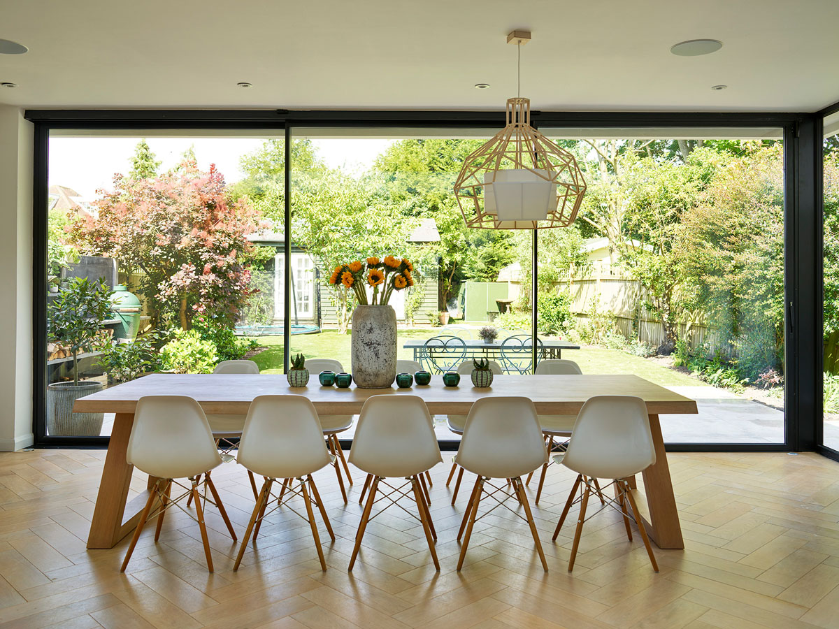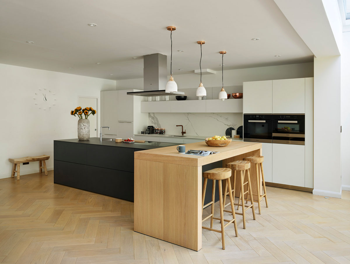 The combined elements in this modern extension creates a welcoming and functional space, from the weekly family routine to weekend dinner parties. Featuring bulthaup b3 island in graphite and white run long the back wall.