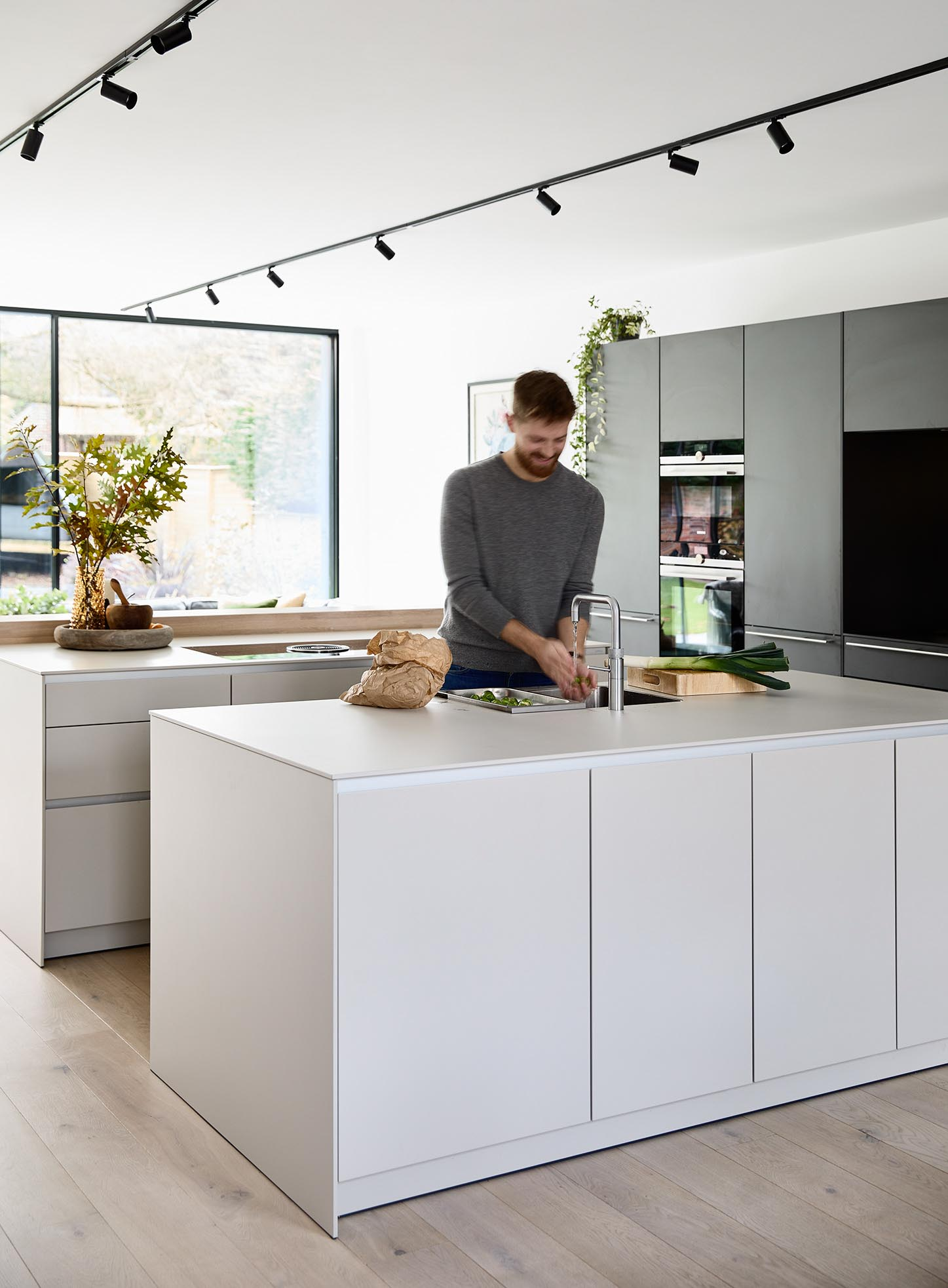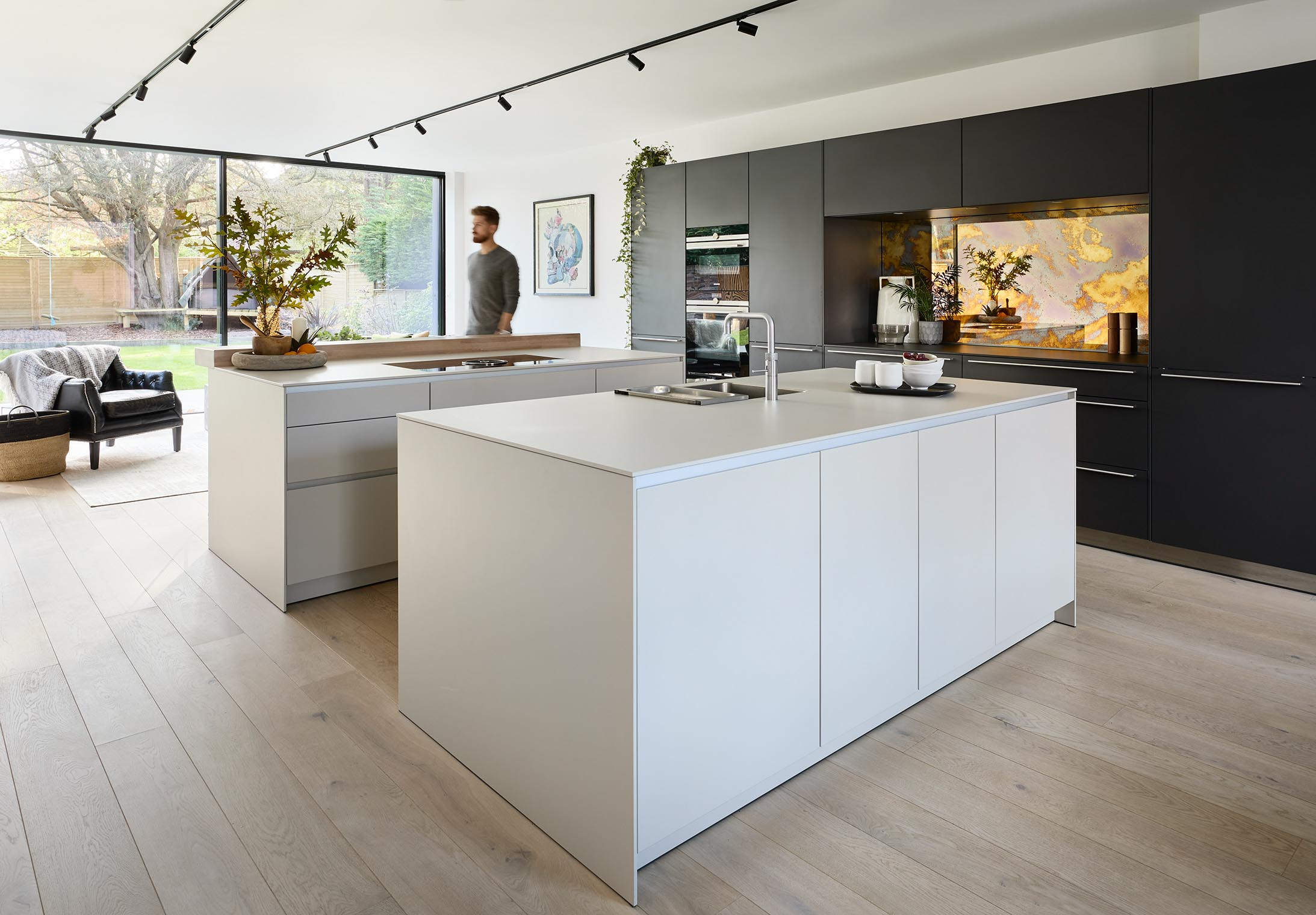 Floor-to-ceiling glazing links the garden to this sociable living space and bespoke elements add a personalised and luxurious feel.