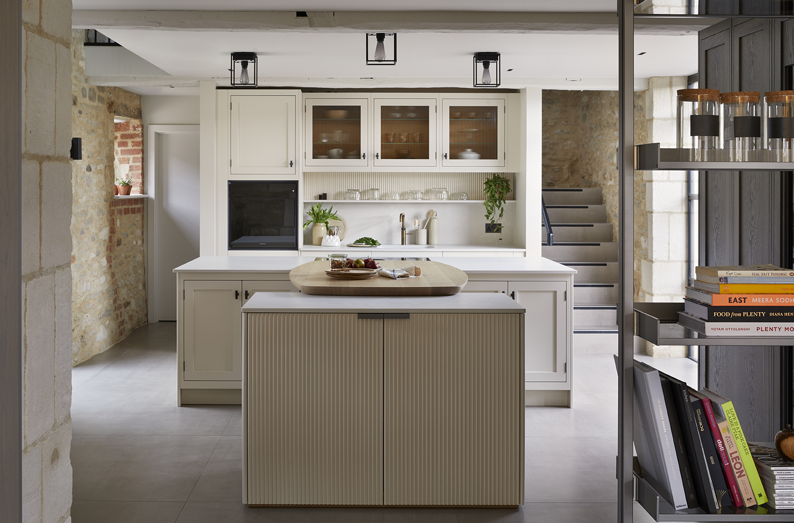 20mm quartz worktops in a concrete finish coupled with Armac Martins T-bar and pull handles add the finishing touches to this sociable living space.