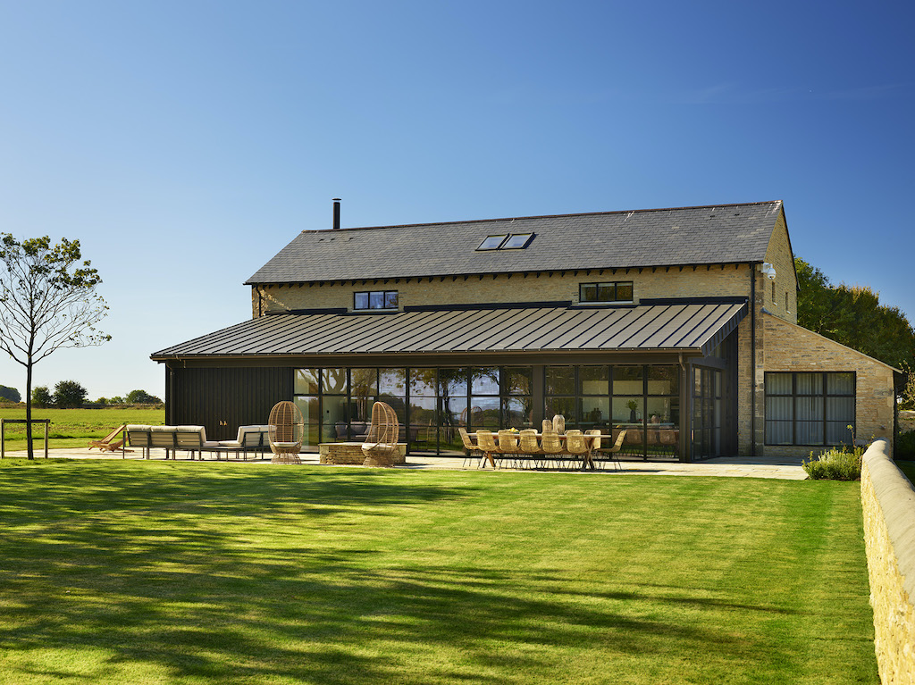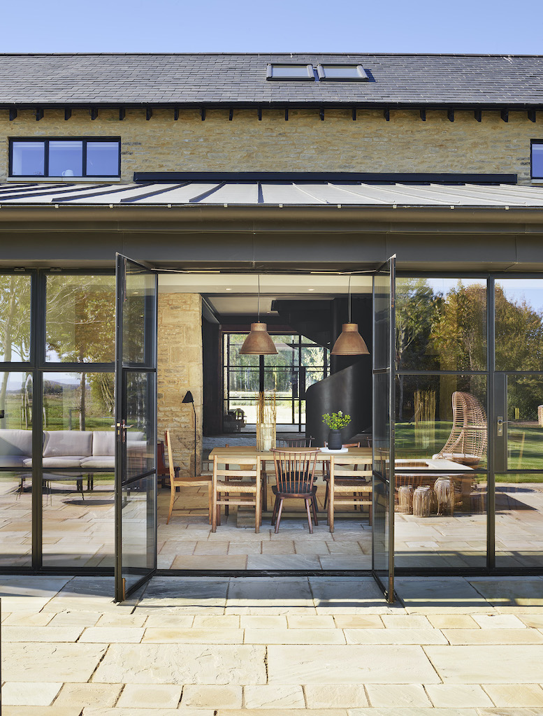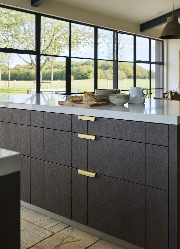 Within a spacious extension with Crittal-style windows framing the rural landscape, this contemporary kitchen is the perfect complement to its traditional setting.