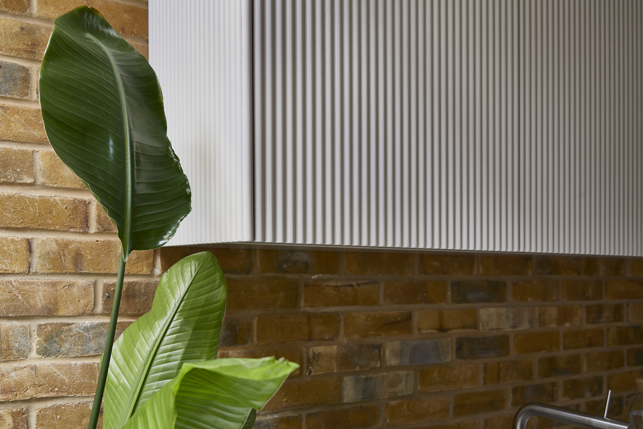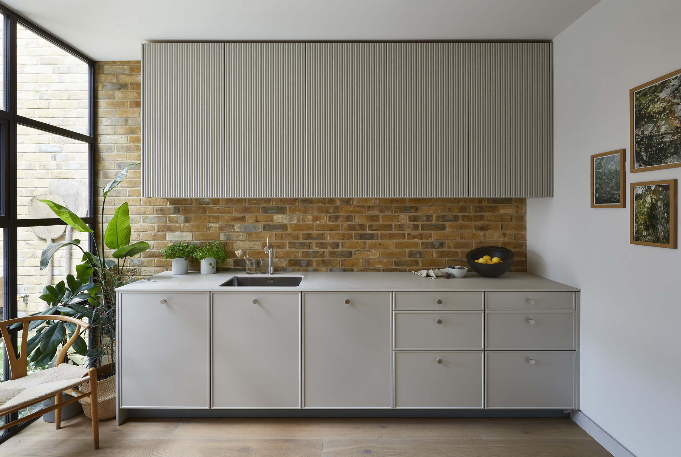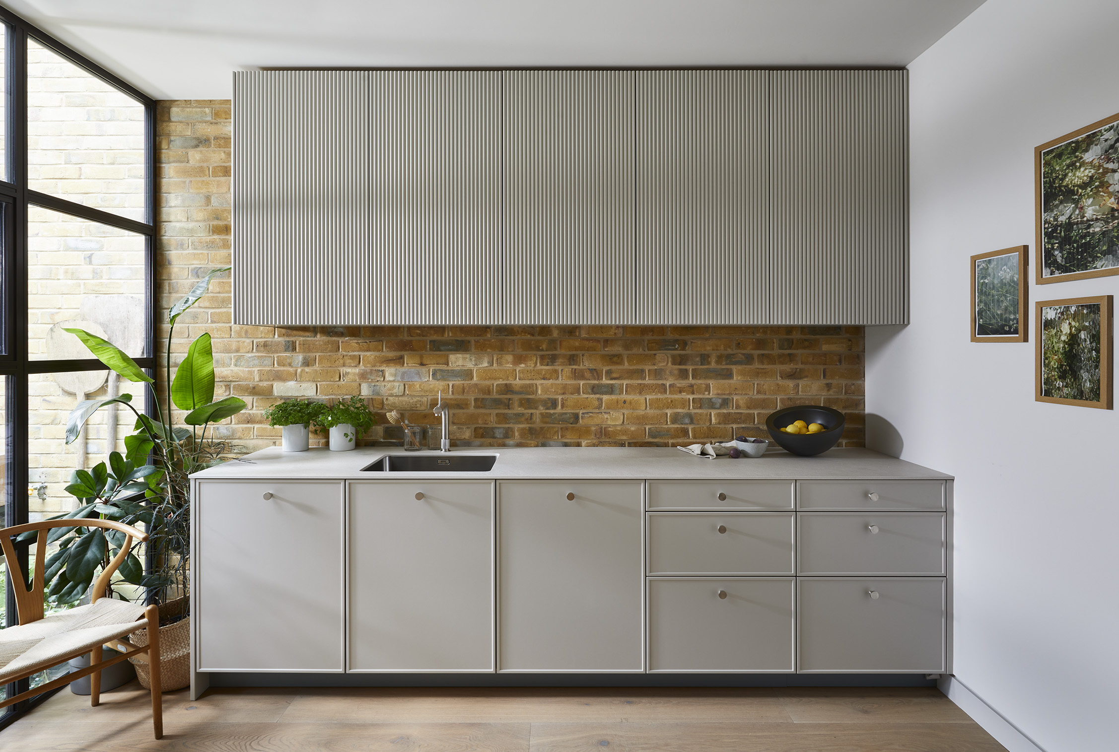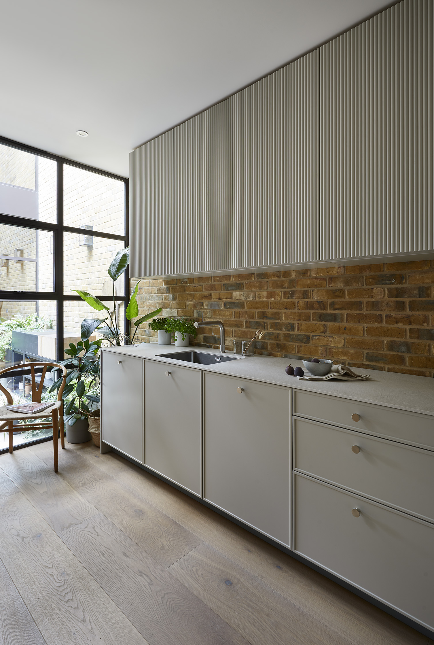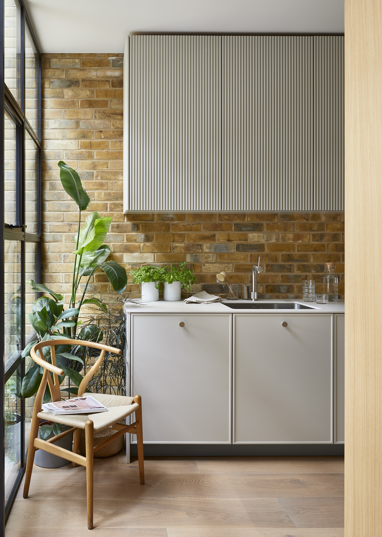 This glazed London apartment kitchen creates impact with texture and tone. As well as creating wow factor, the extra deep alcove also gives the cook a functional zone, with space to prep on the low run opposite.