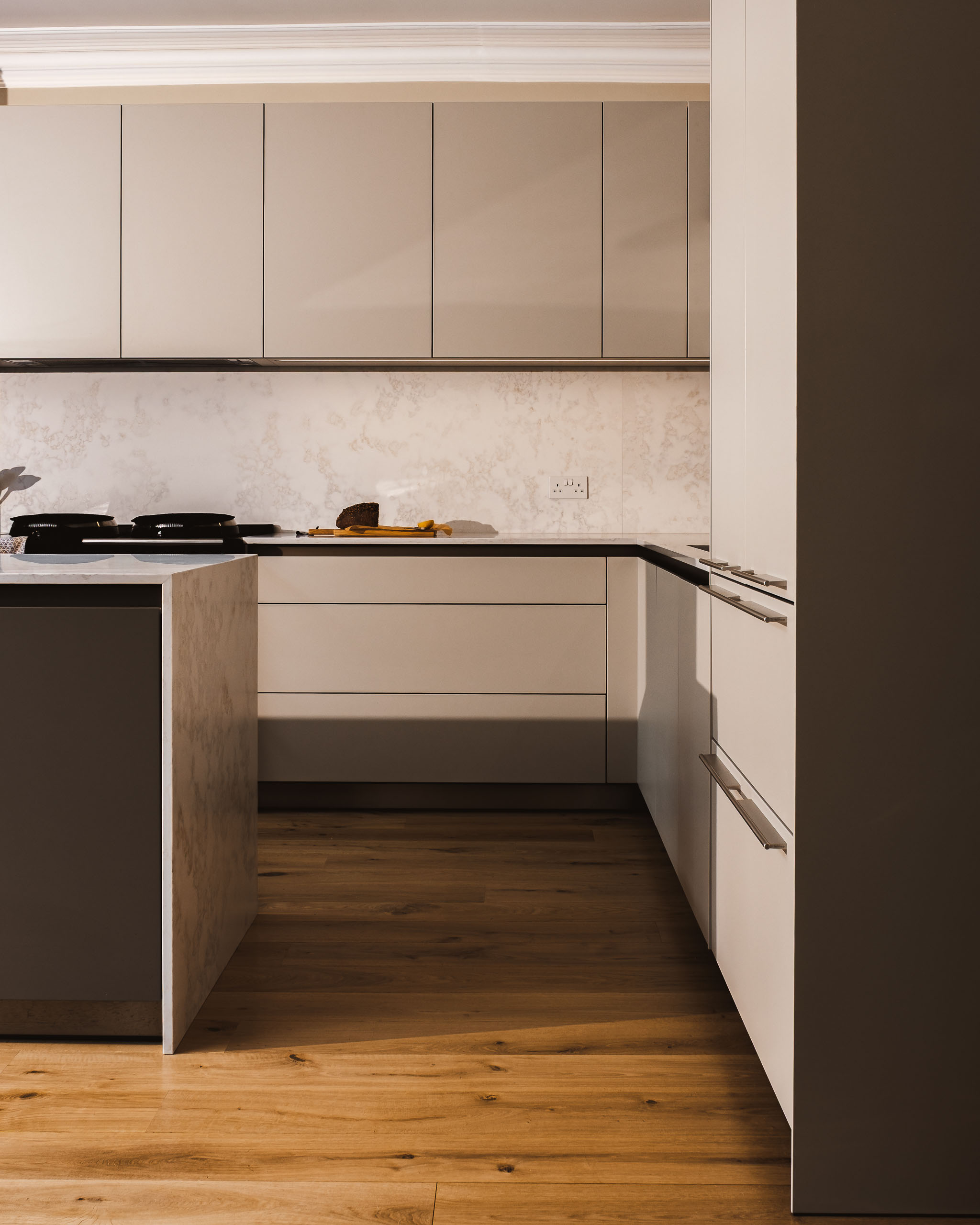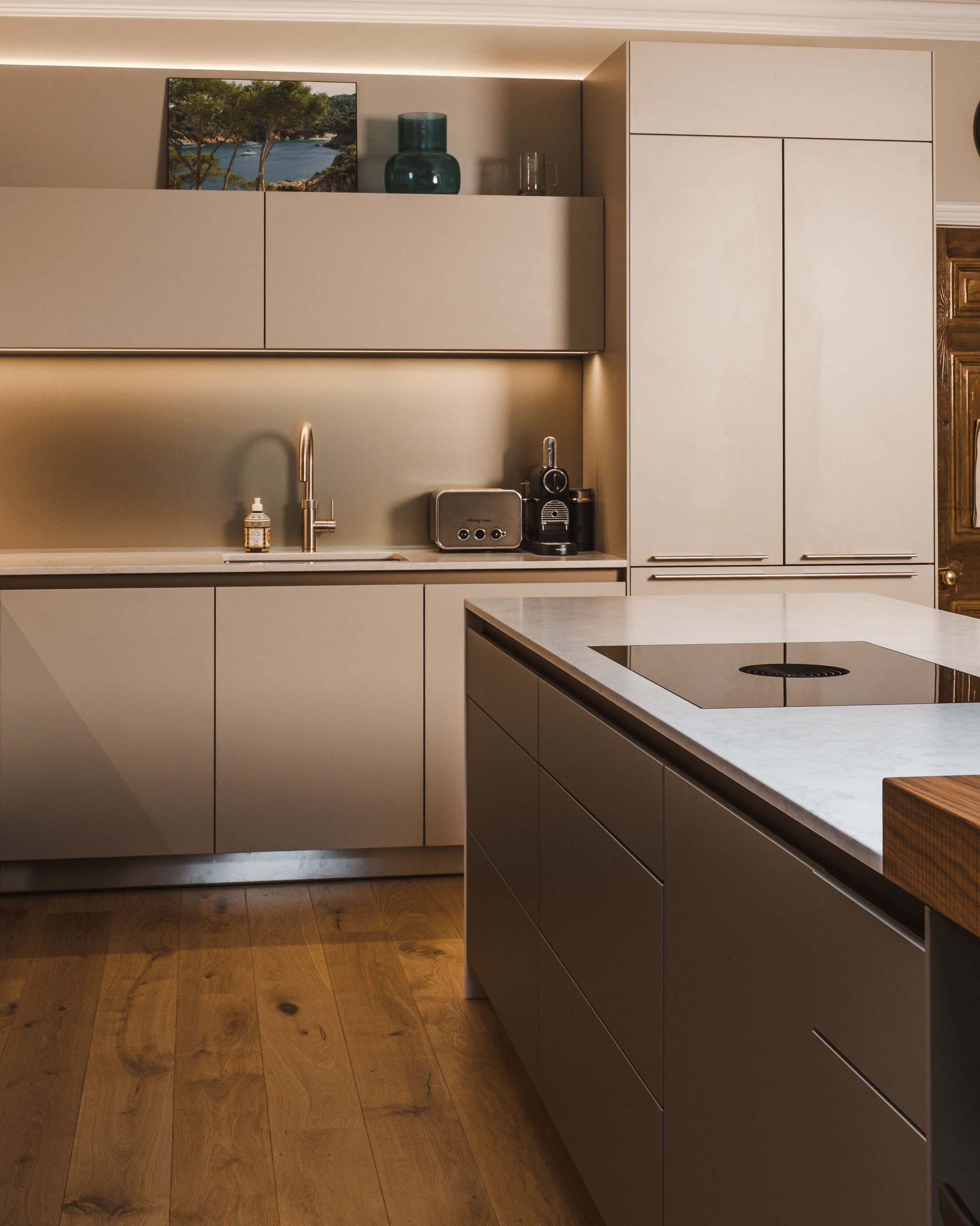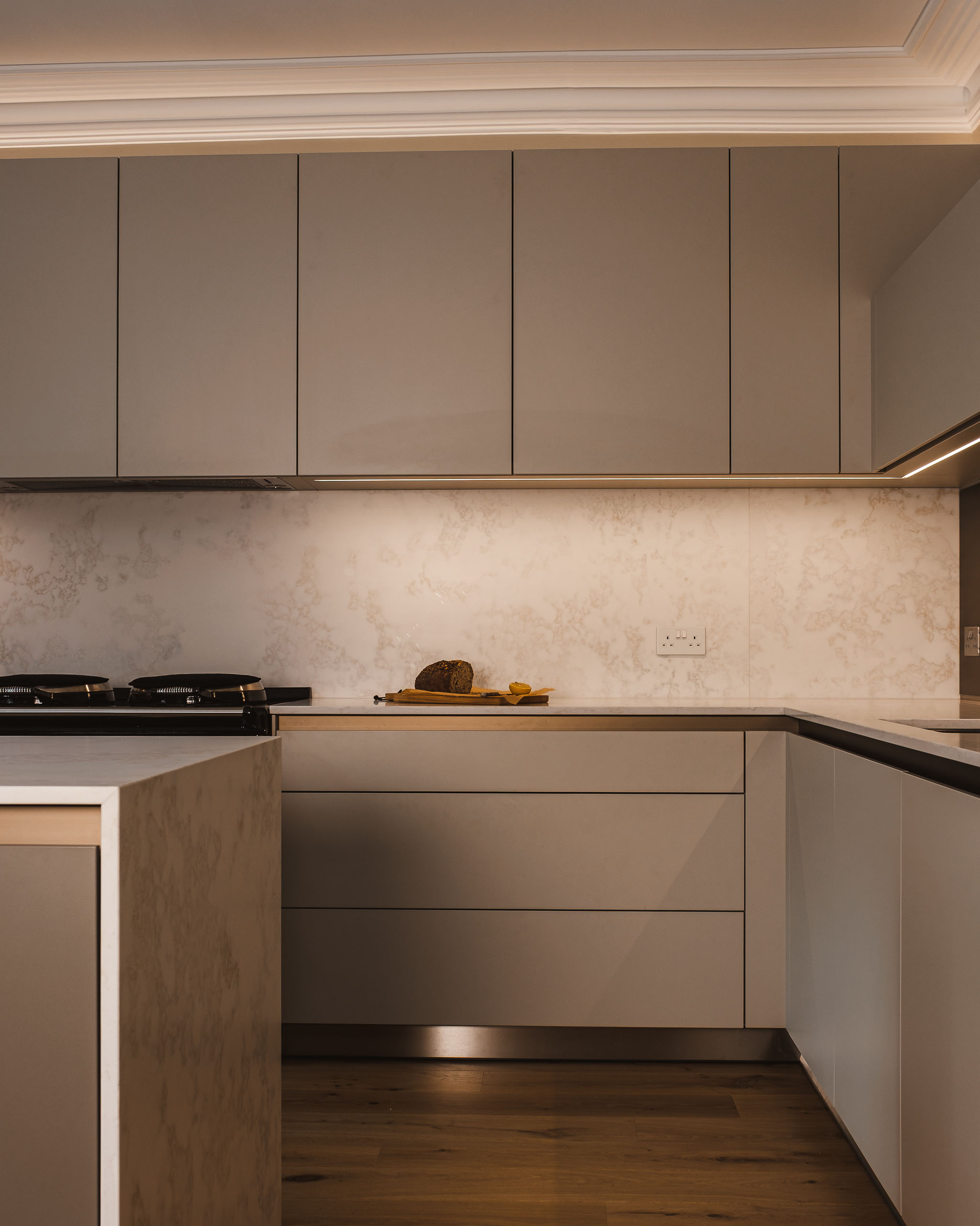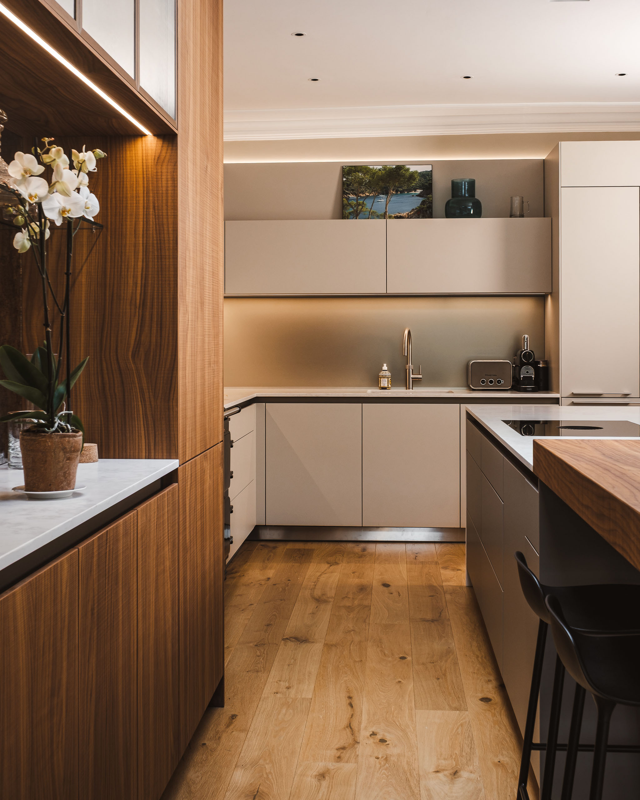 Full-height cabinetry meets the original plaster cornice. Recessed LED lighting is designed to celebrate the home's architectural height.