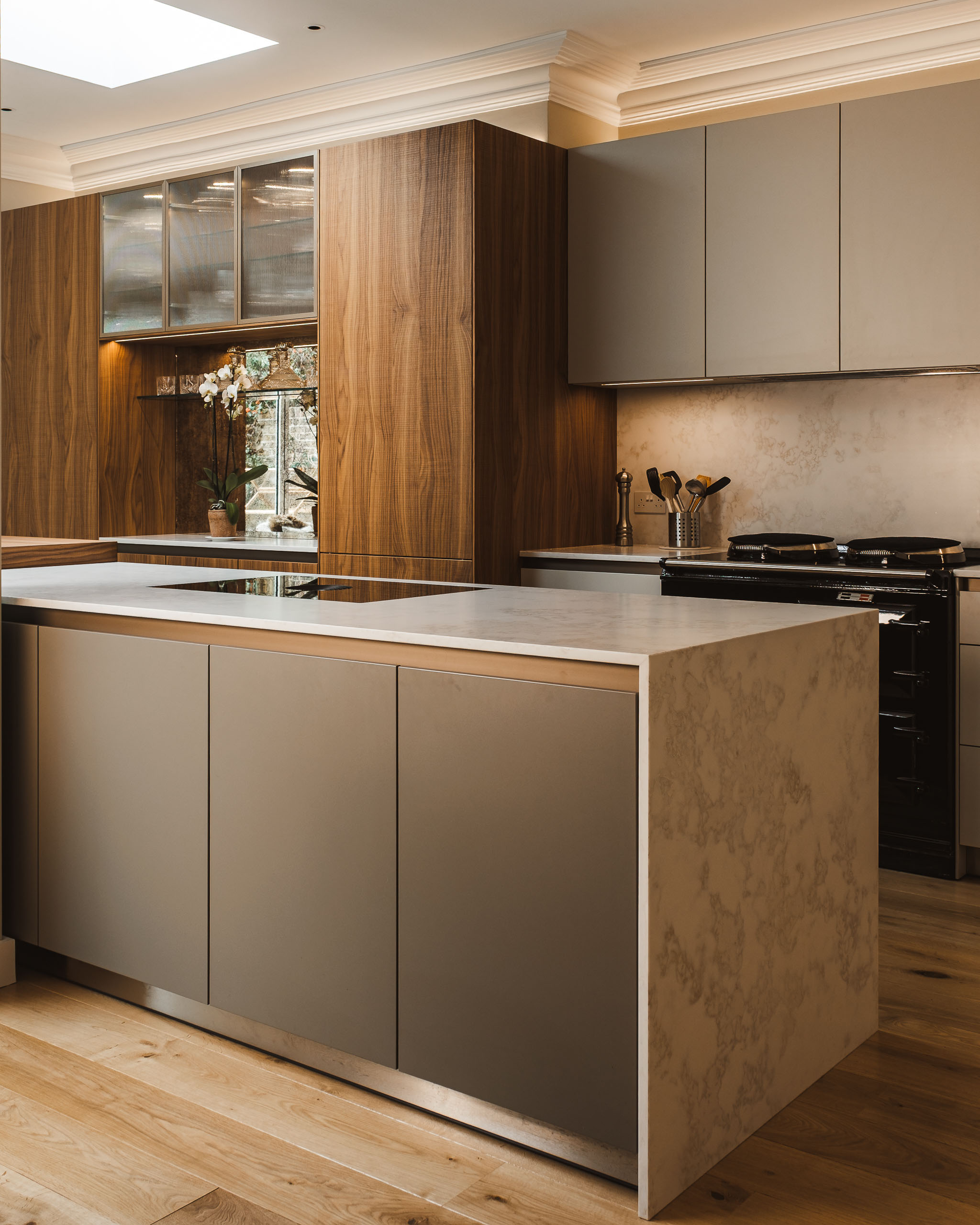 In a quaint corner of South-West London, an uncompromising blend of materials comes together in synergy to create a contemporary kitchen designed with entertaining in mind. We were excited to work with a returning client on their second bulthaup kitchen project and begin another design adventure together. The residents are a family, including two young adult sons, who wanted a kitchen in which they could entertain as well as enjoy daily life. A bar with bronze-framed pinstripe glass wall units and an antique mirror splashback has become a real feature, as has the existing AGA. The family wanted to keep the AGA, provided it didn’t overpower the space or interrupt the flow and sociability of the room. A calming palette featuring shades of walnut, sand-beige aluminium, flint and gravel laminate with antique mirror and engineered stone work surfaces complements the clean lines of the bulthaup b3 furniture. As part of the project, the team removed a wall but had to leave a structural pillar on show. We planned the kitchen as if the pillar weren’t there; by cladding the bar in walnut, it cleverly draws your eye away. It is those little details that make the difference.Eagle-eyed readers may notice how the walnut breakfast bar matches the bar opposite in width dimensions. We love how the warmth of the wood pairs with the smoothness of the stone and laminate finishes, adding the final touches to a much-loved family kitchen that will truly stand the test of time.