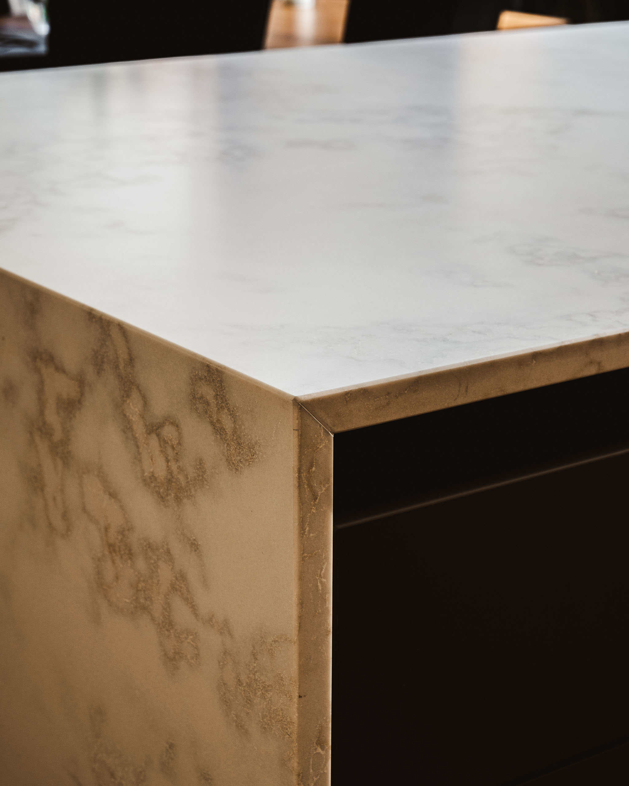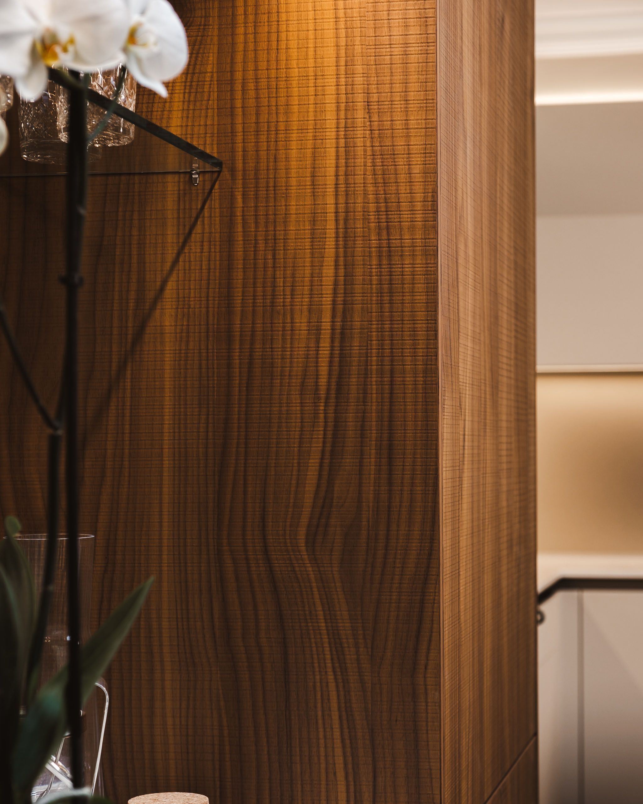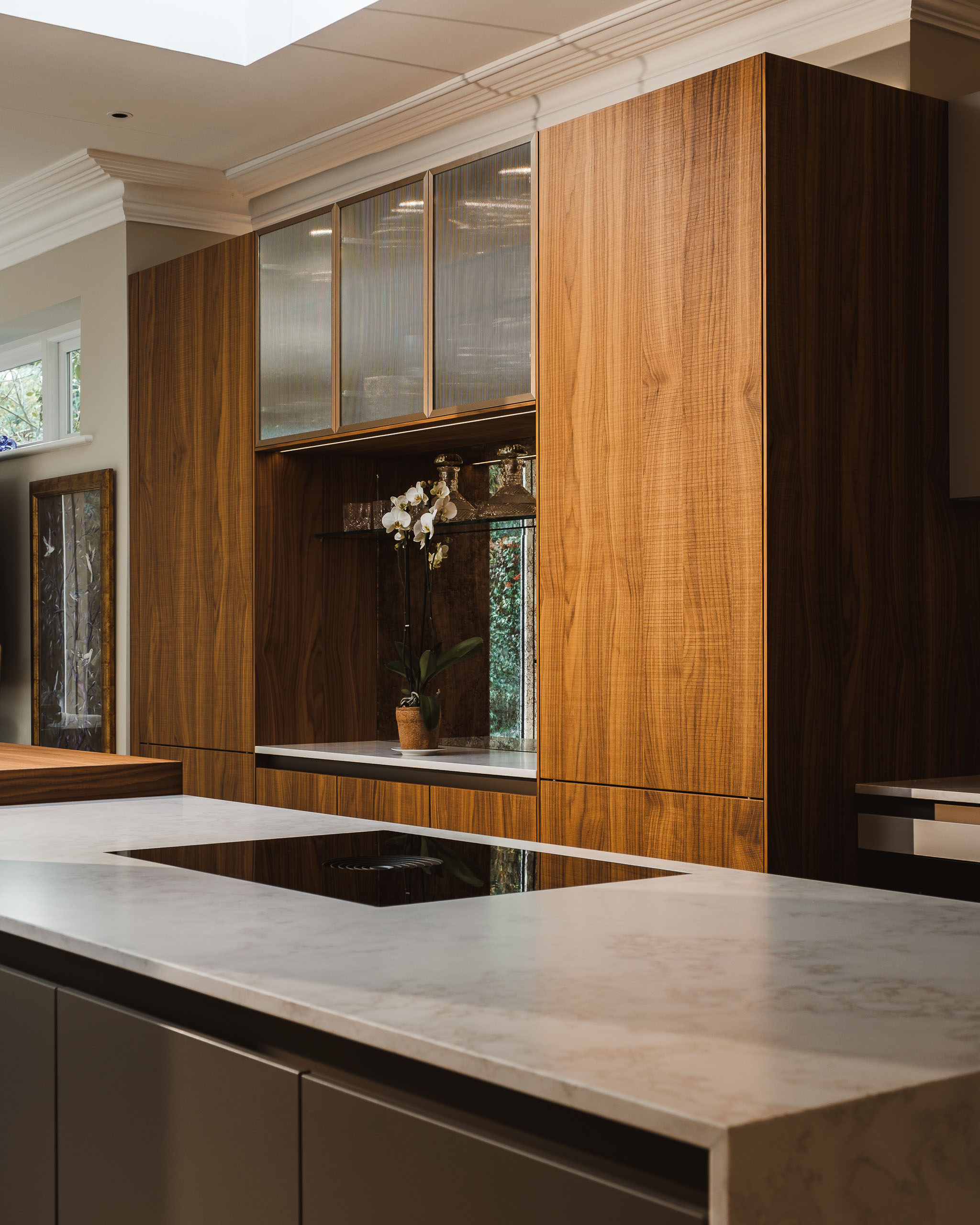 This bar zone, clad in walnut with bronze pinstripe glass and an antique mirror splashback, transforms the kitchen into a venue for entertaining.