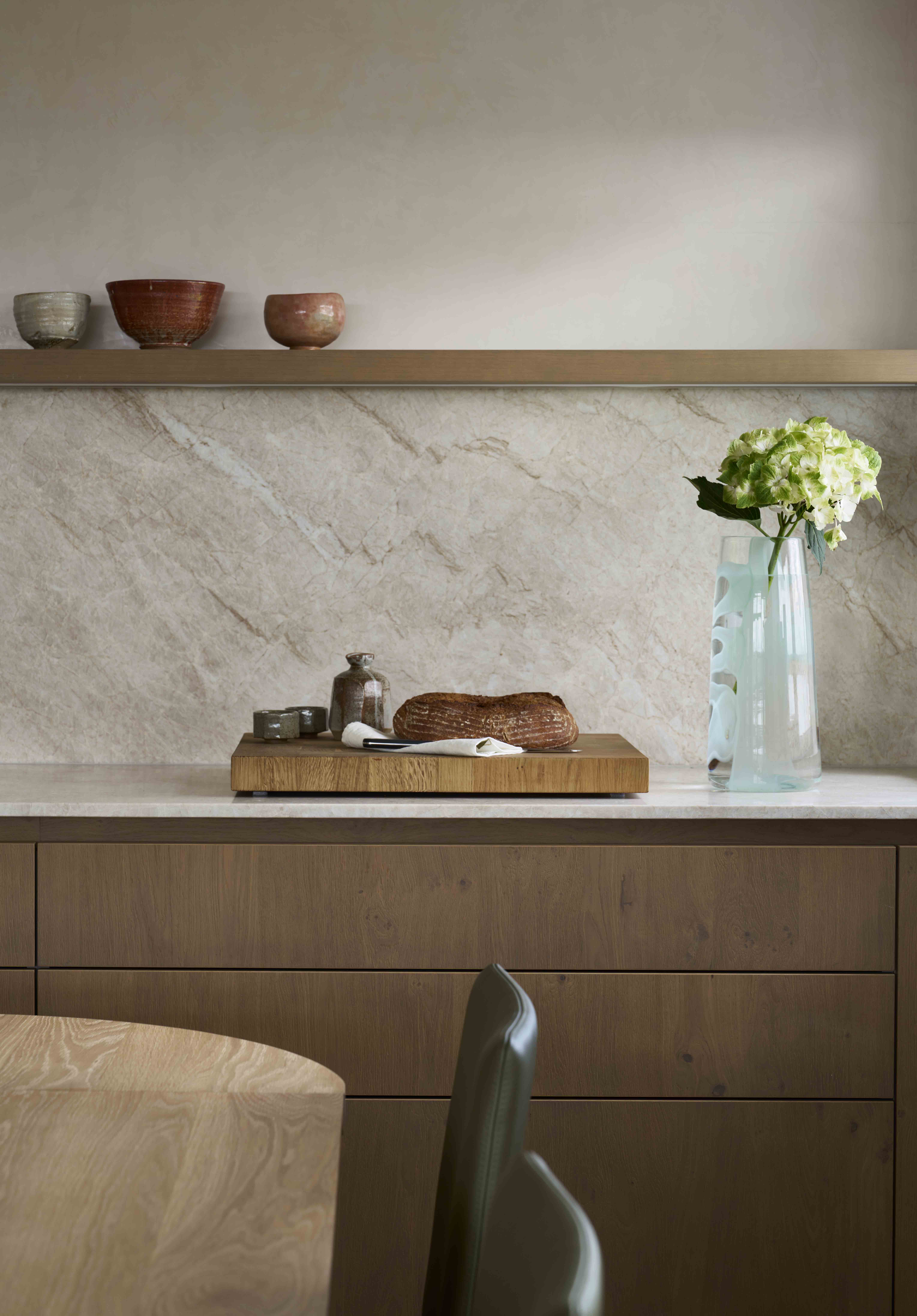 The kitchen serves as the social heart, and the handpicked materials set the frequency. We opted for Taj Mahal marble for its translucent, cloud-like depth, pairing it with the warmth and texture of pastel smoked oak, cashmere and Umbra laminate.
