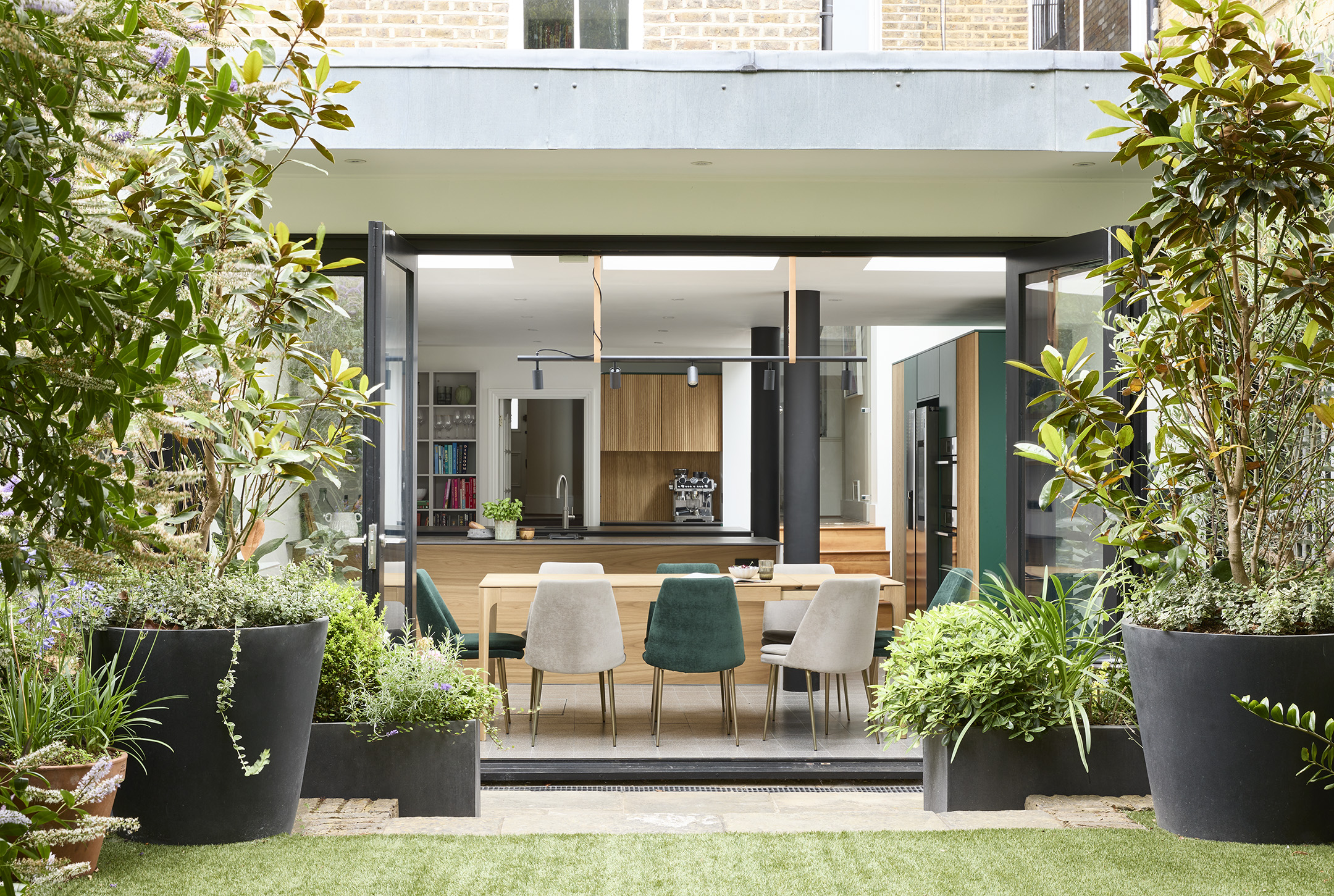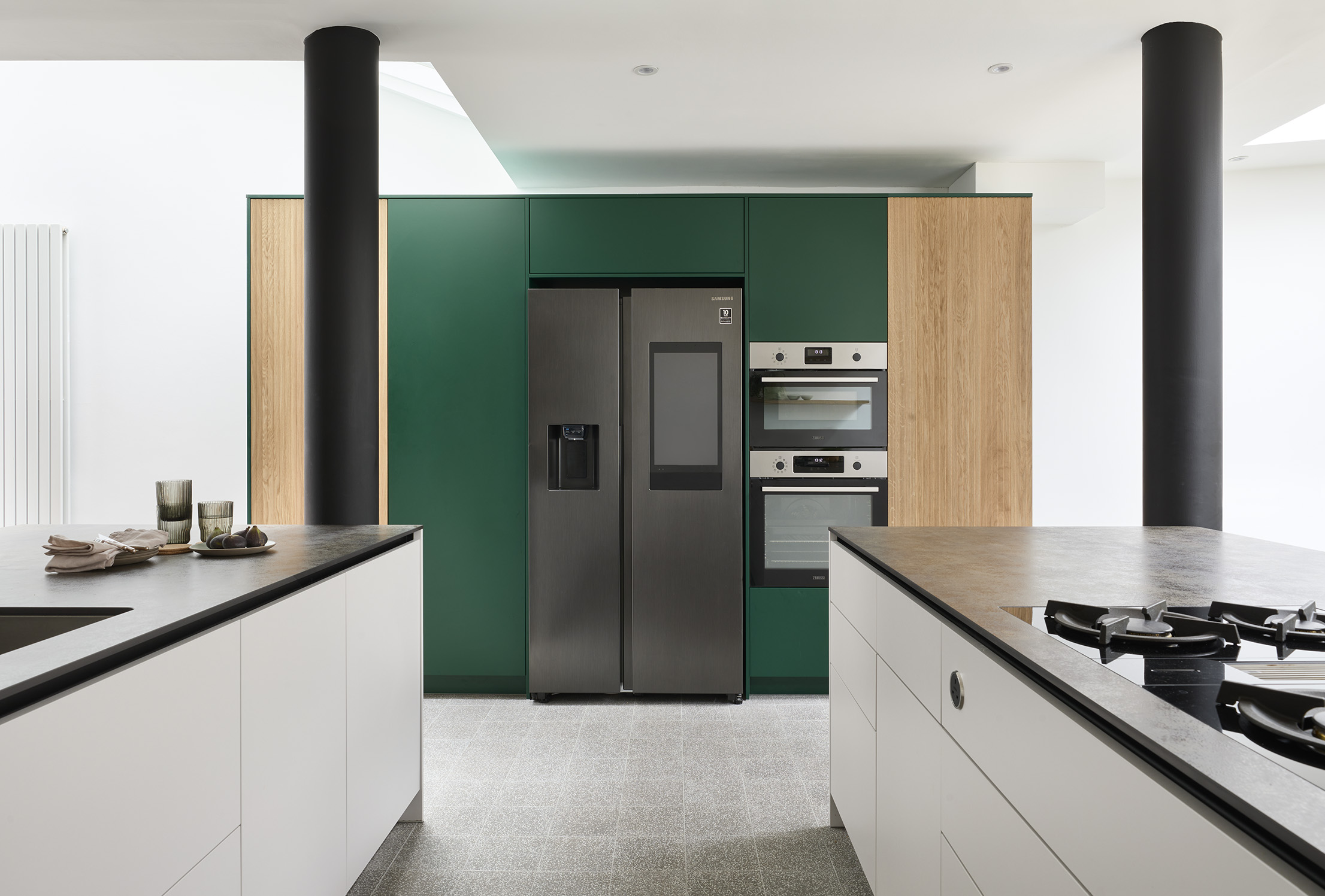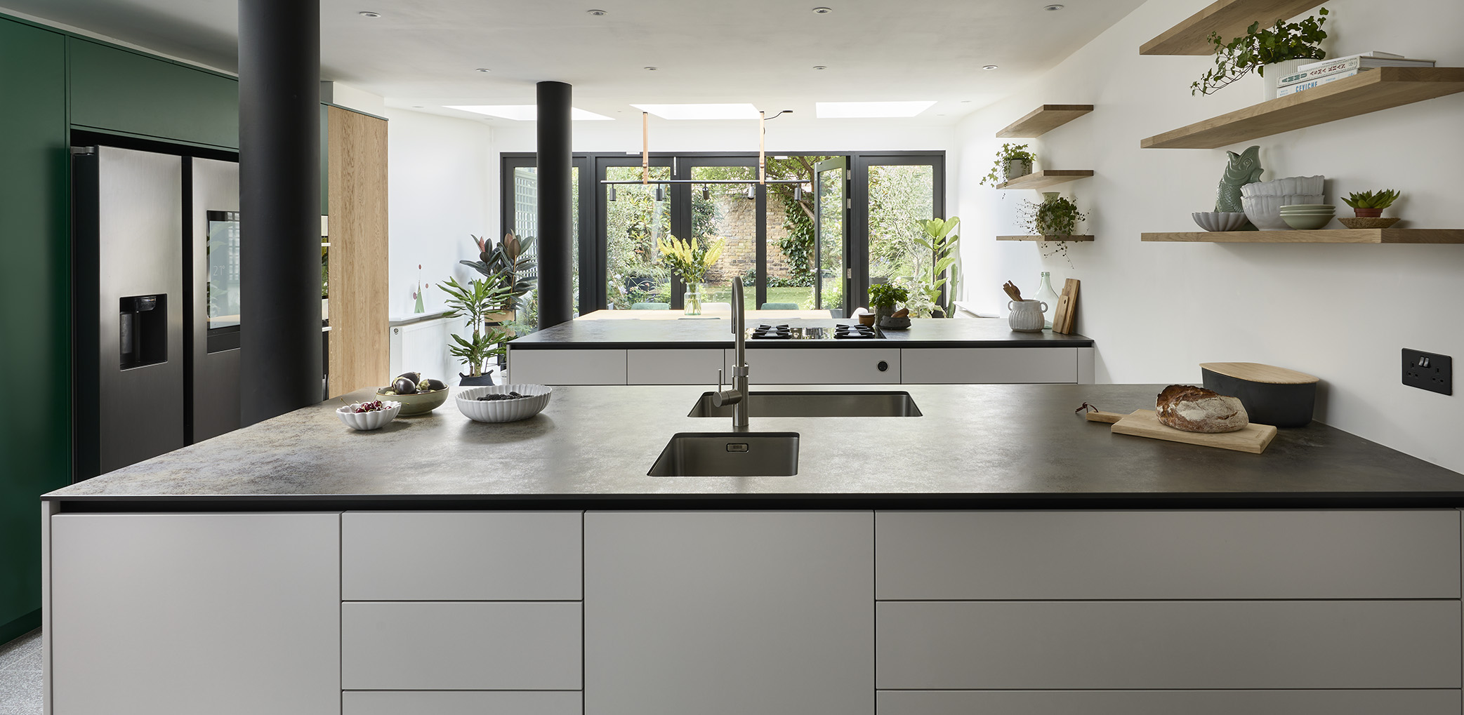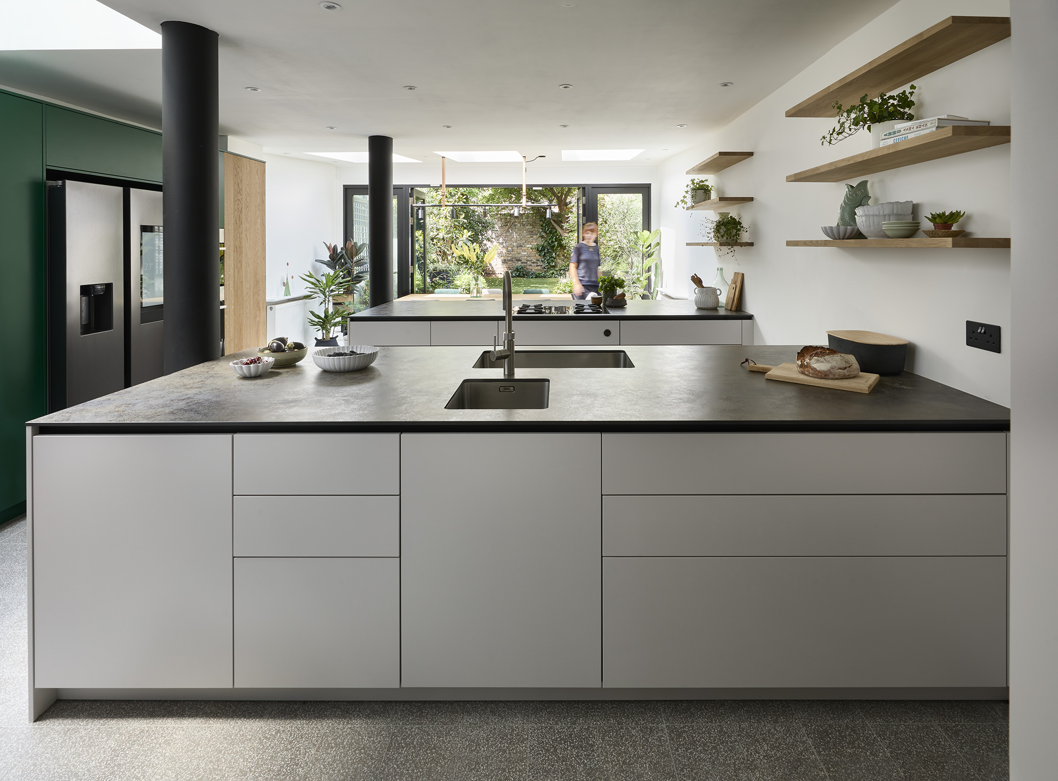 Textures and earthy tones combine to create a harmonious, sociable kitchen living space in a subterranean London family home. Stone, stainless steel, marble, reeded glass and slatted timber come together in a celebration of materials, in true systemKA style.