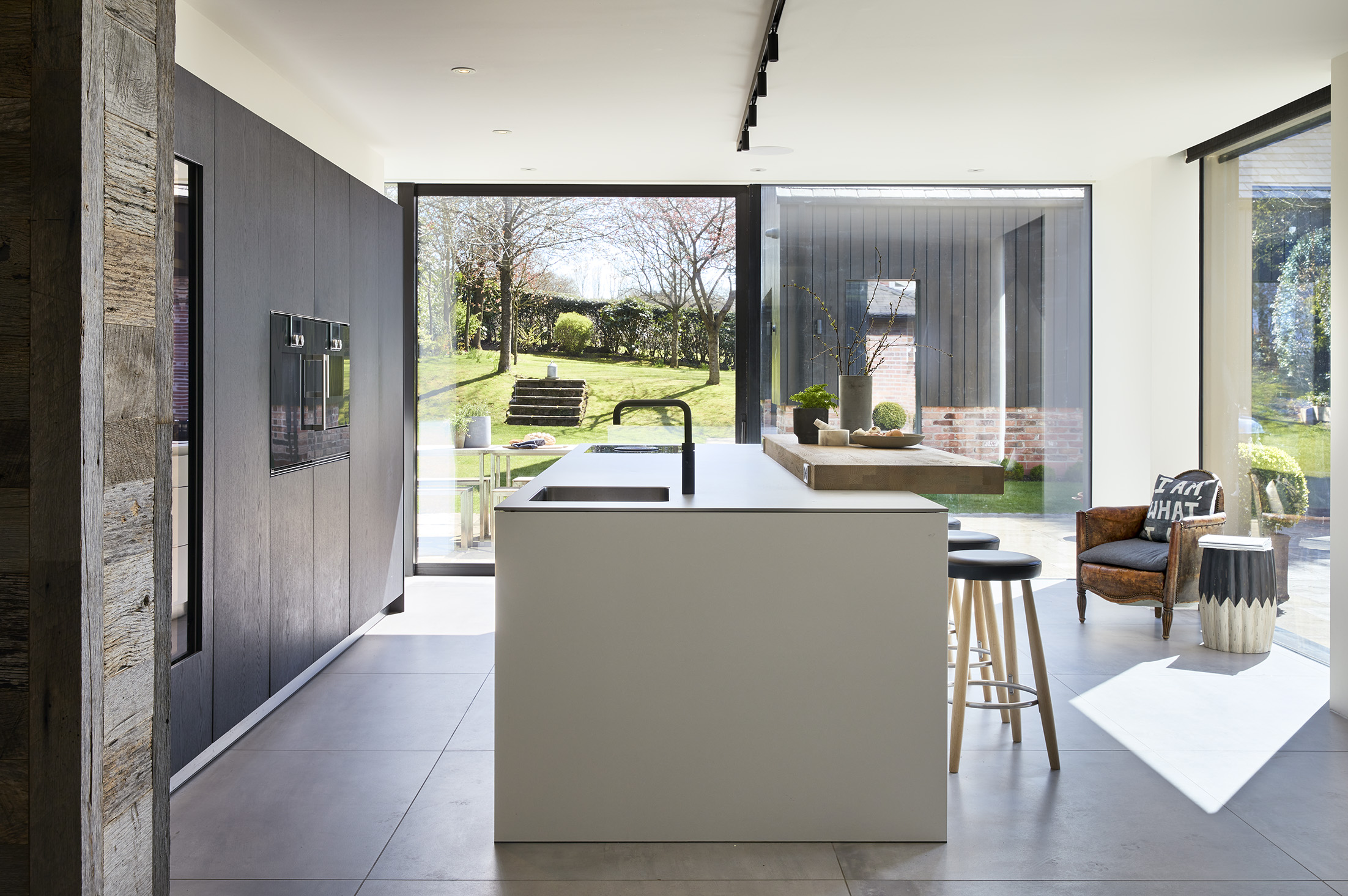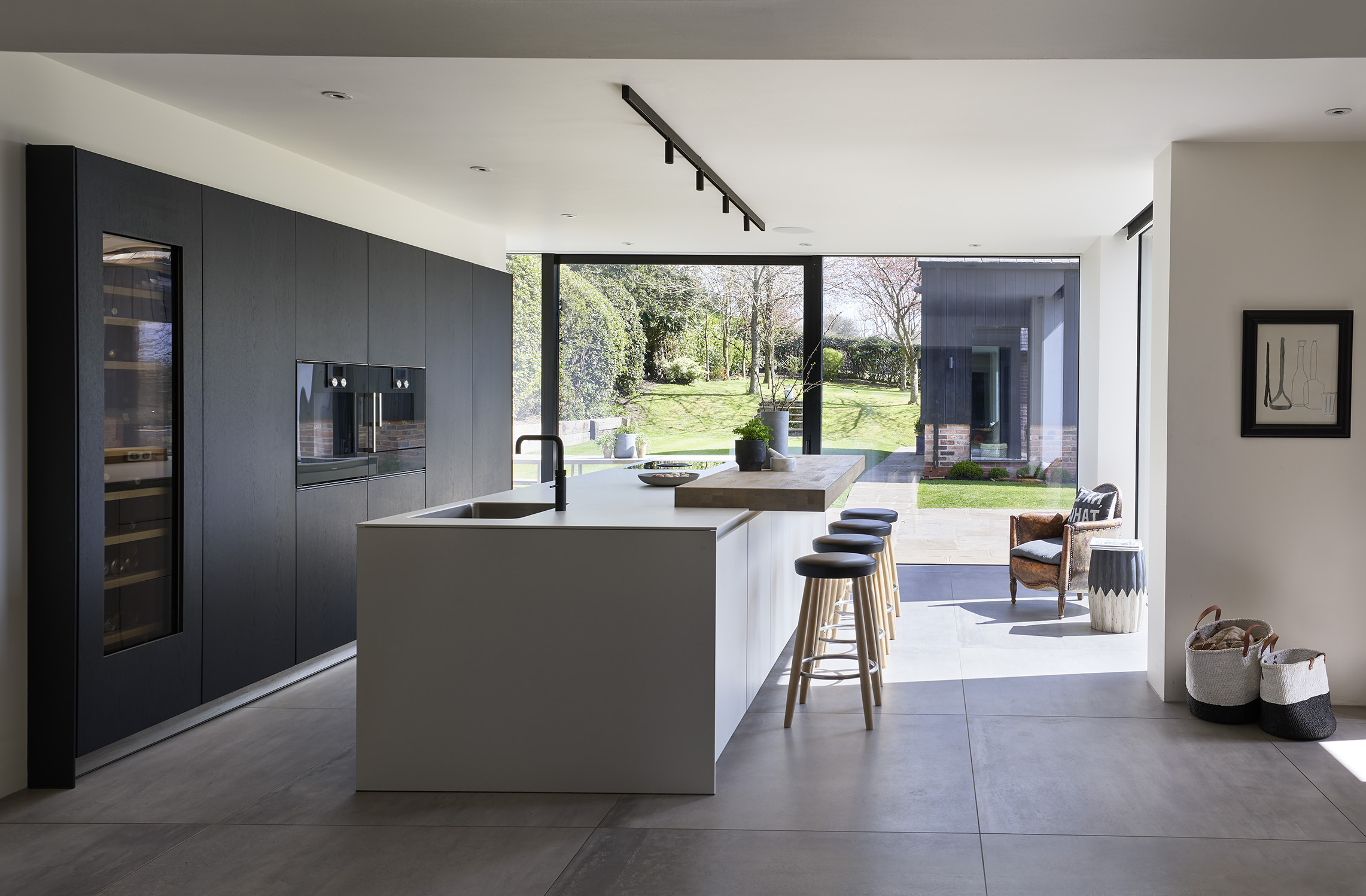 Top priority for Caroline was to create a sociable, informal space where family and friends could enjoy time together. The tall block, in bulthaup’s black-grey oak, adds a luxurious modern feel that blends in with the timber cladding on the extension, while the natural oak on the breakfast bar echoes the organic feel of the wood and natural materials used throughout this beautiful Cheshire country retreat.