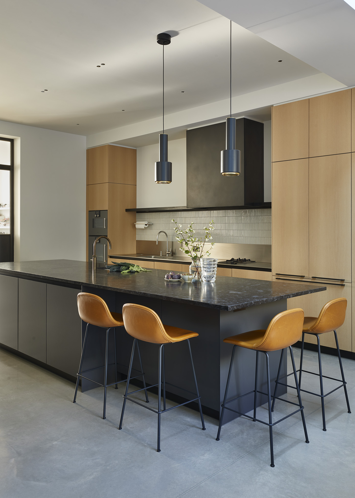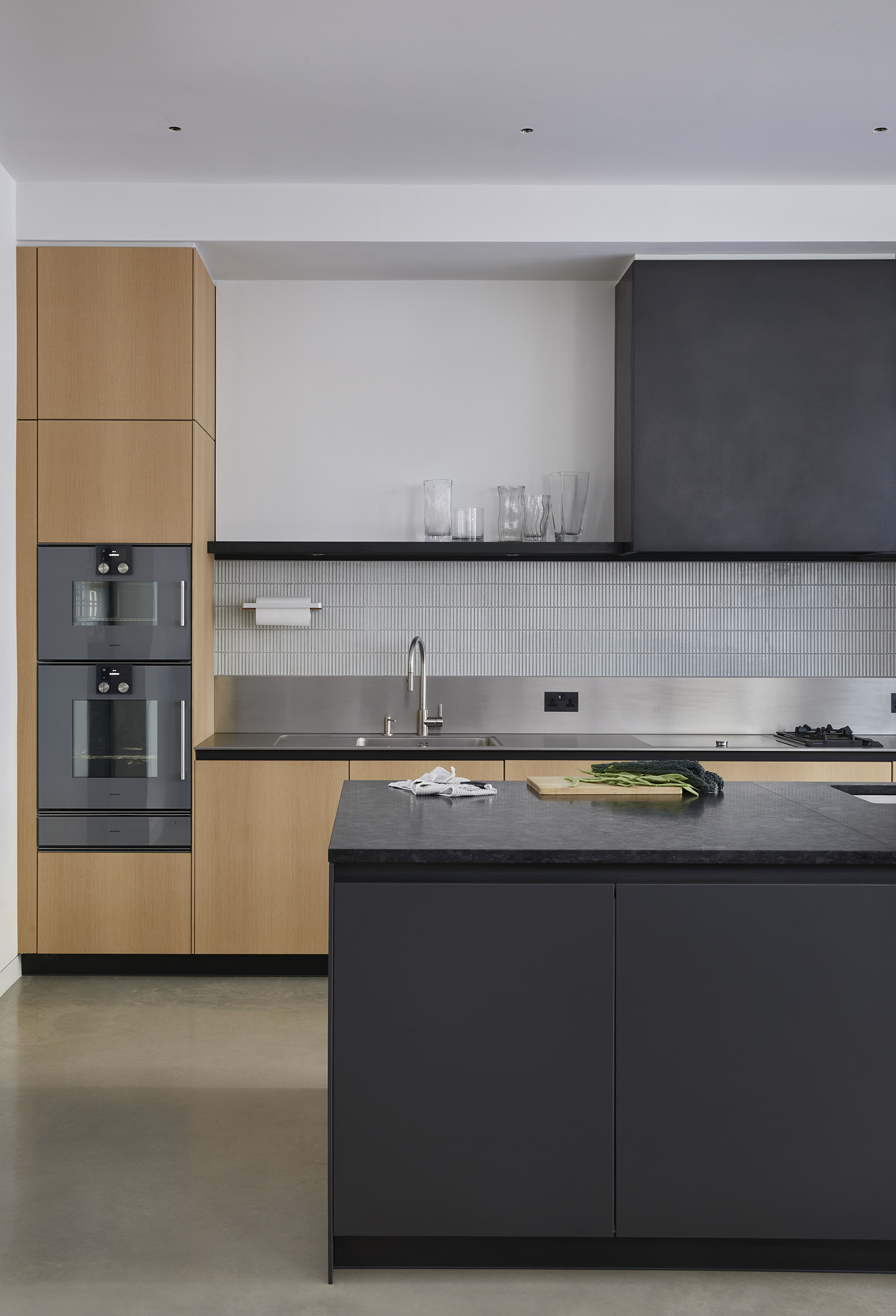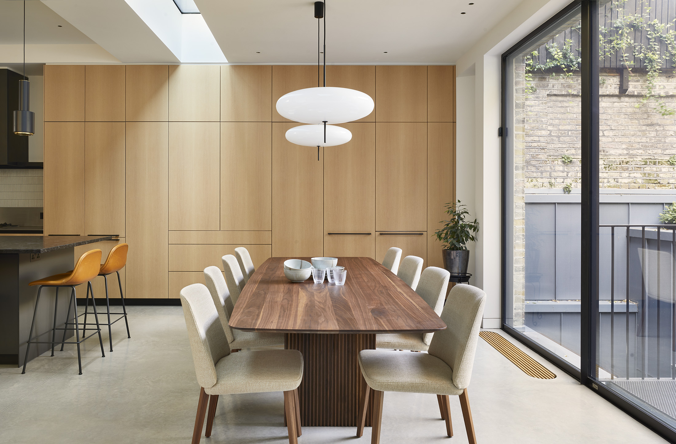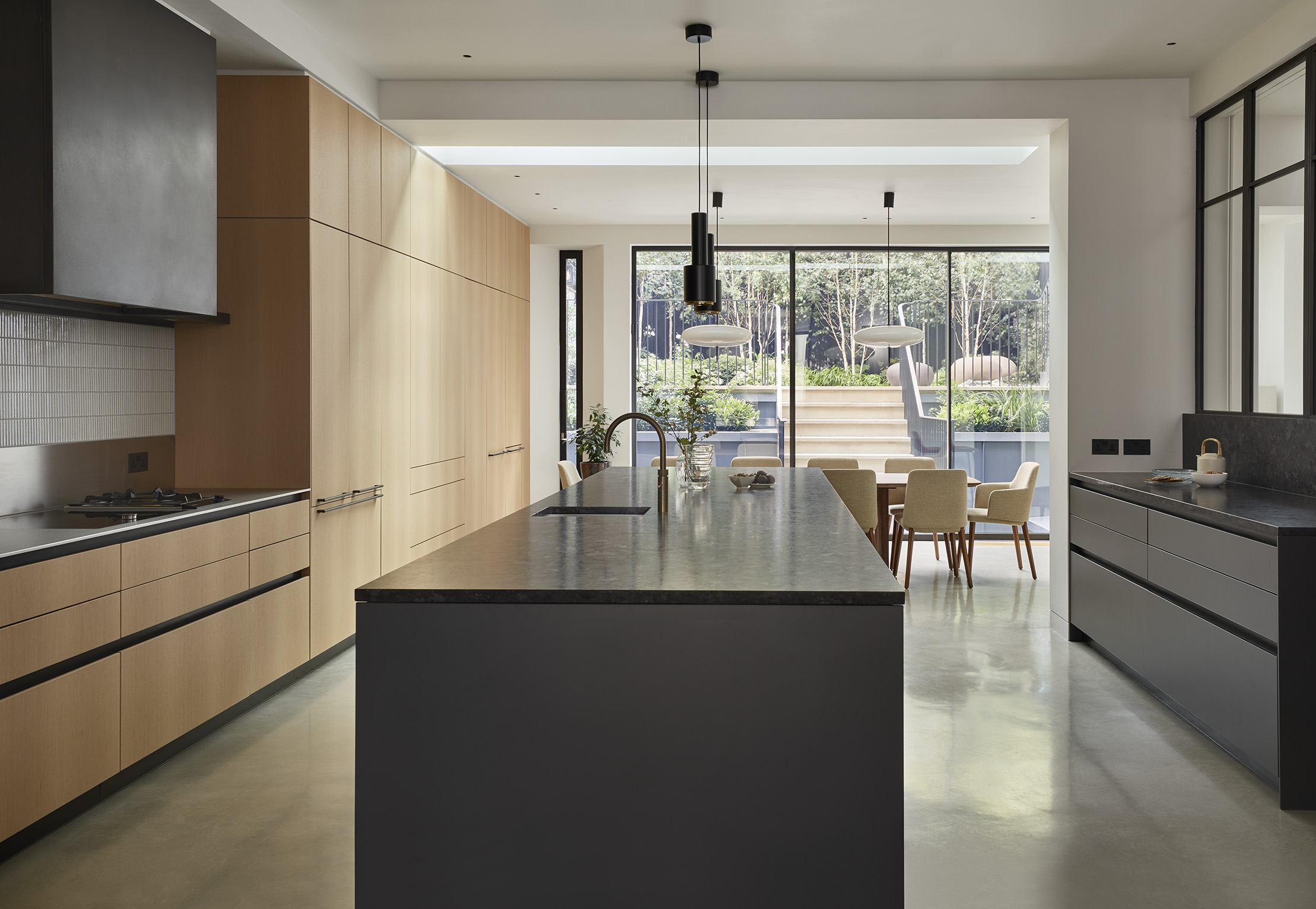 With industrial details like the stainless steel worktops blending effortlessly with the natural oak doors. Crittal style glazing creates a broken plan feel to the space that allows views of the landscaped garden to be seen from the hall and other rooms.