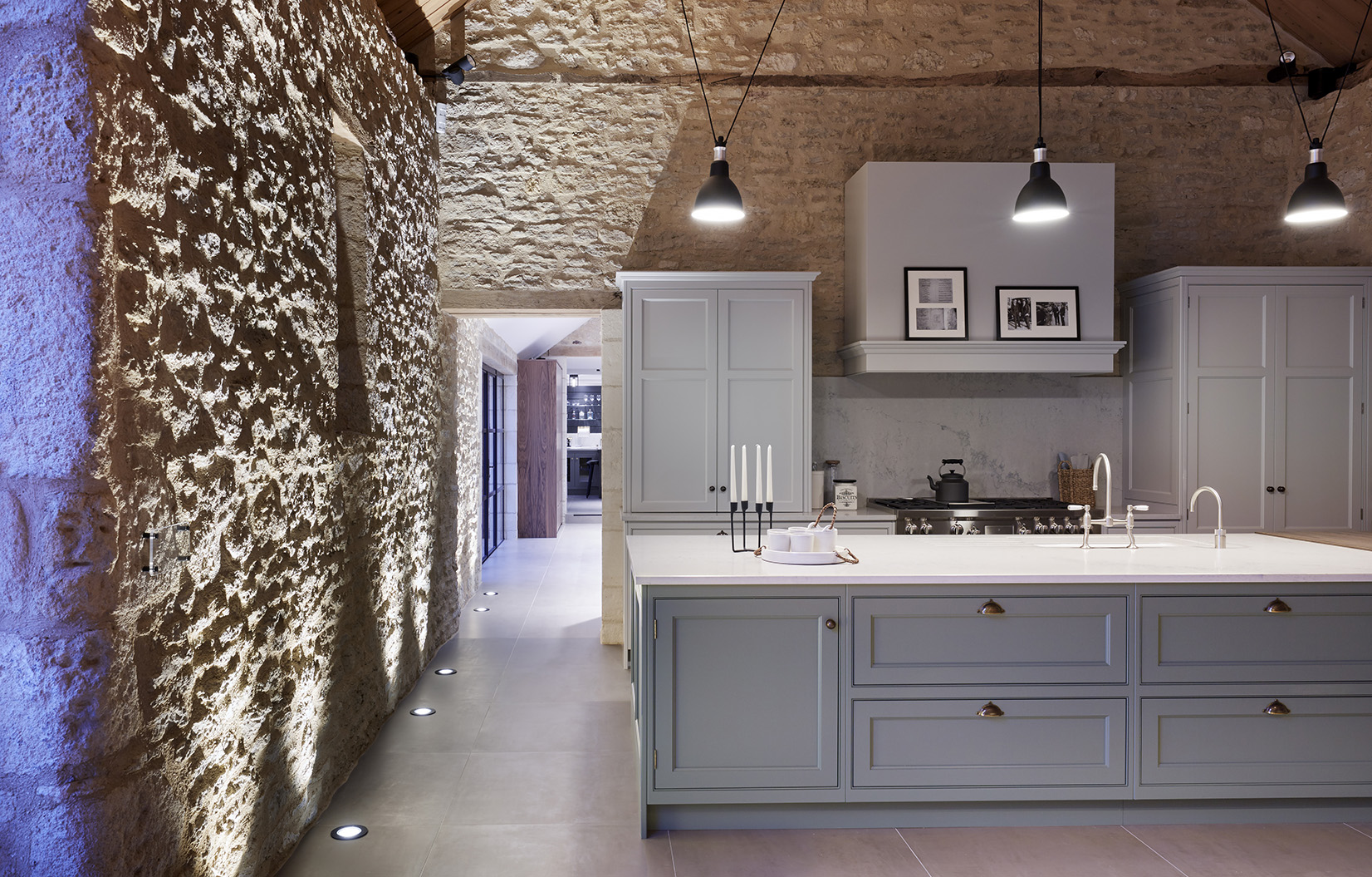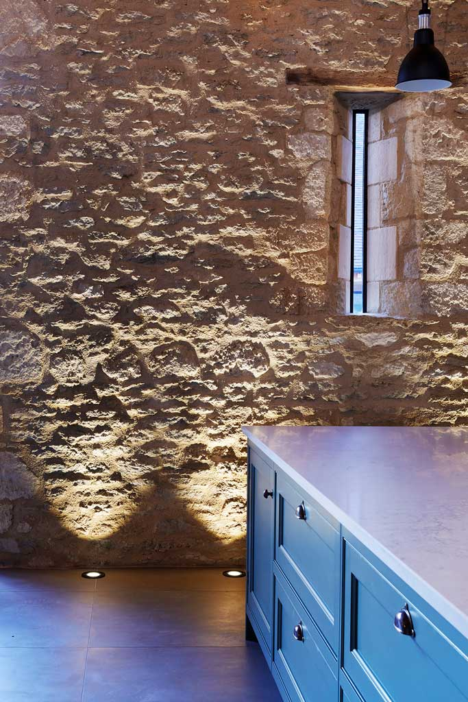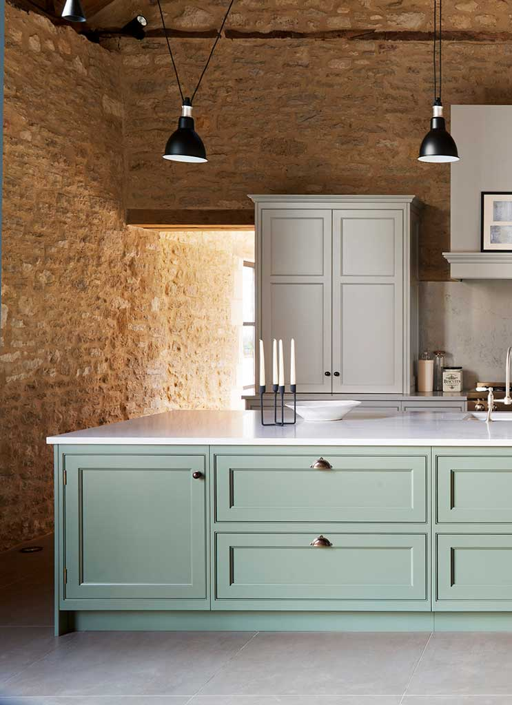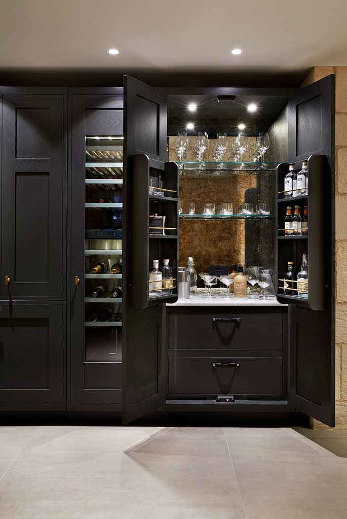 Contrasting materials, from traditional stone, wood and metal to contemporary use of glass and concrete, work harmoniously together to prove that period buildings are conducive to modern living. The versatility and timeless beauty of the handcrafted Teddy Edwards cabinetry and furniture is revealed when you take a closer look to appreciate the time-served solid wood construction and the meticulous attention to detail, from the hand-painted finishes and the beautiful, hardwearing work surfaces through to the carefully chosen cabinet handles and bespoke organised wine storage.