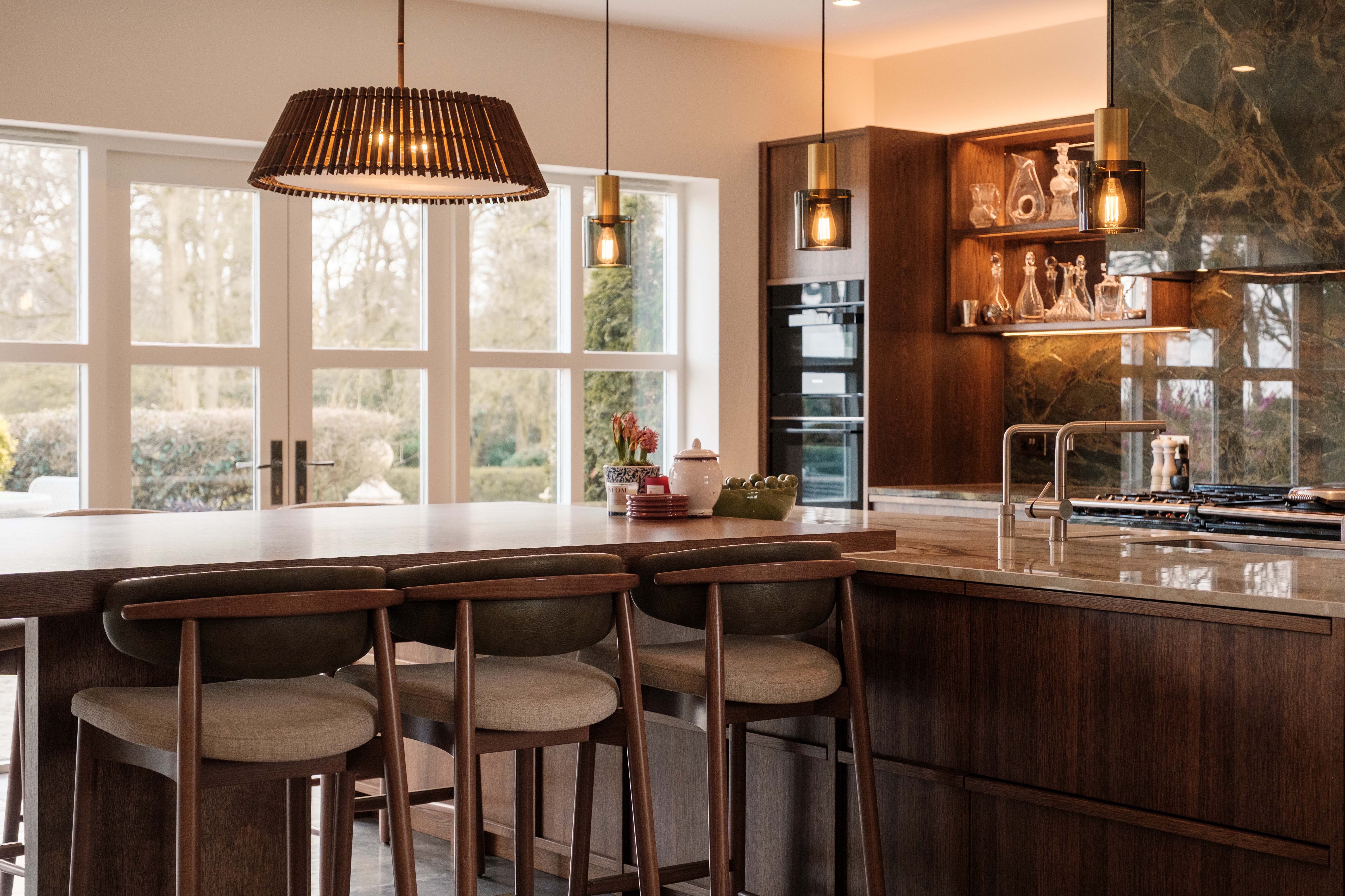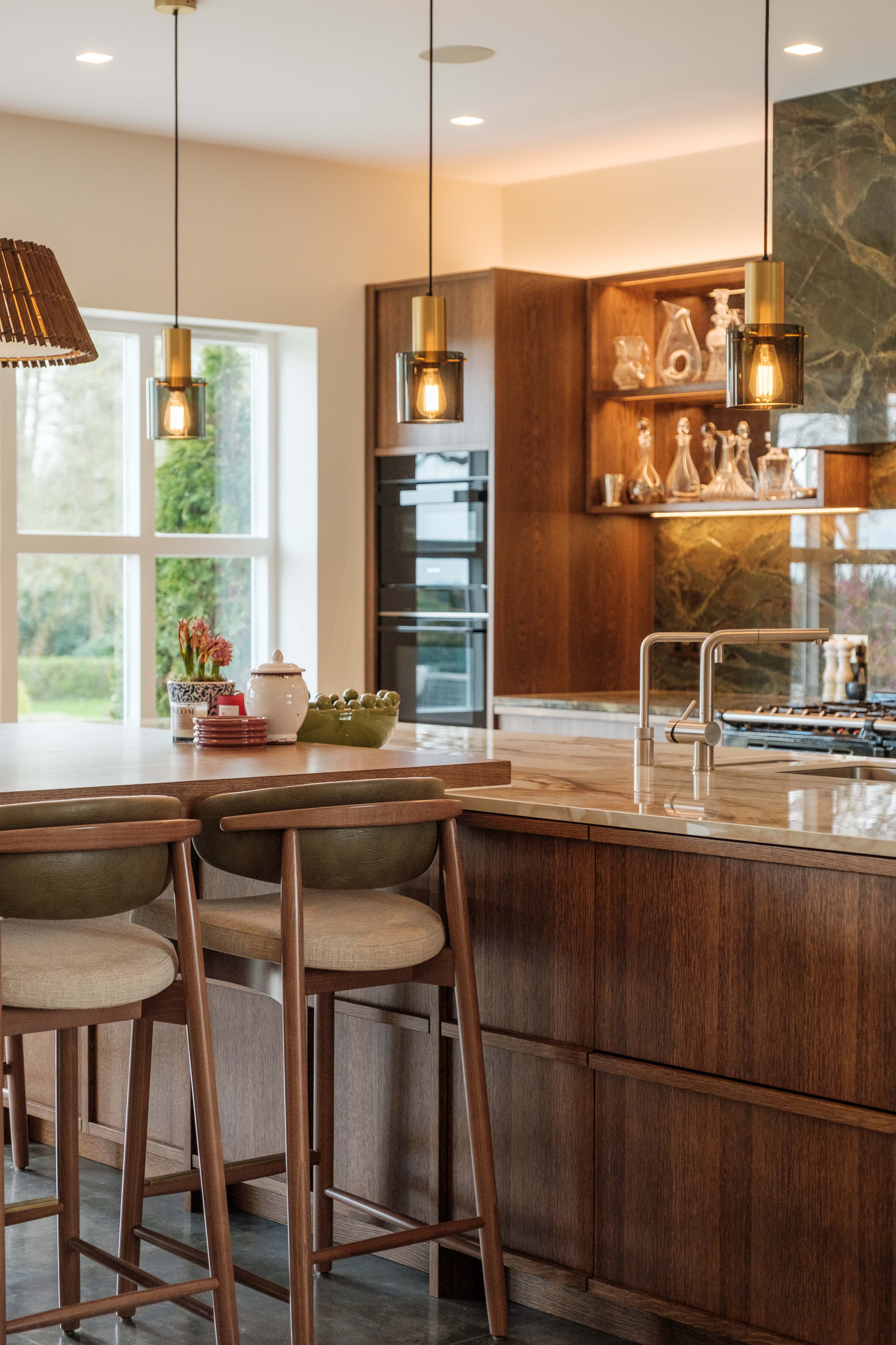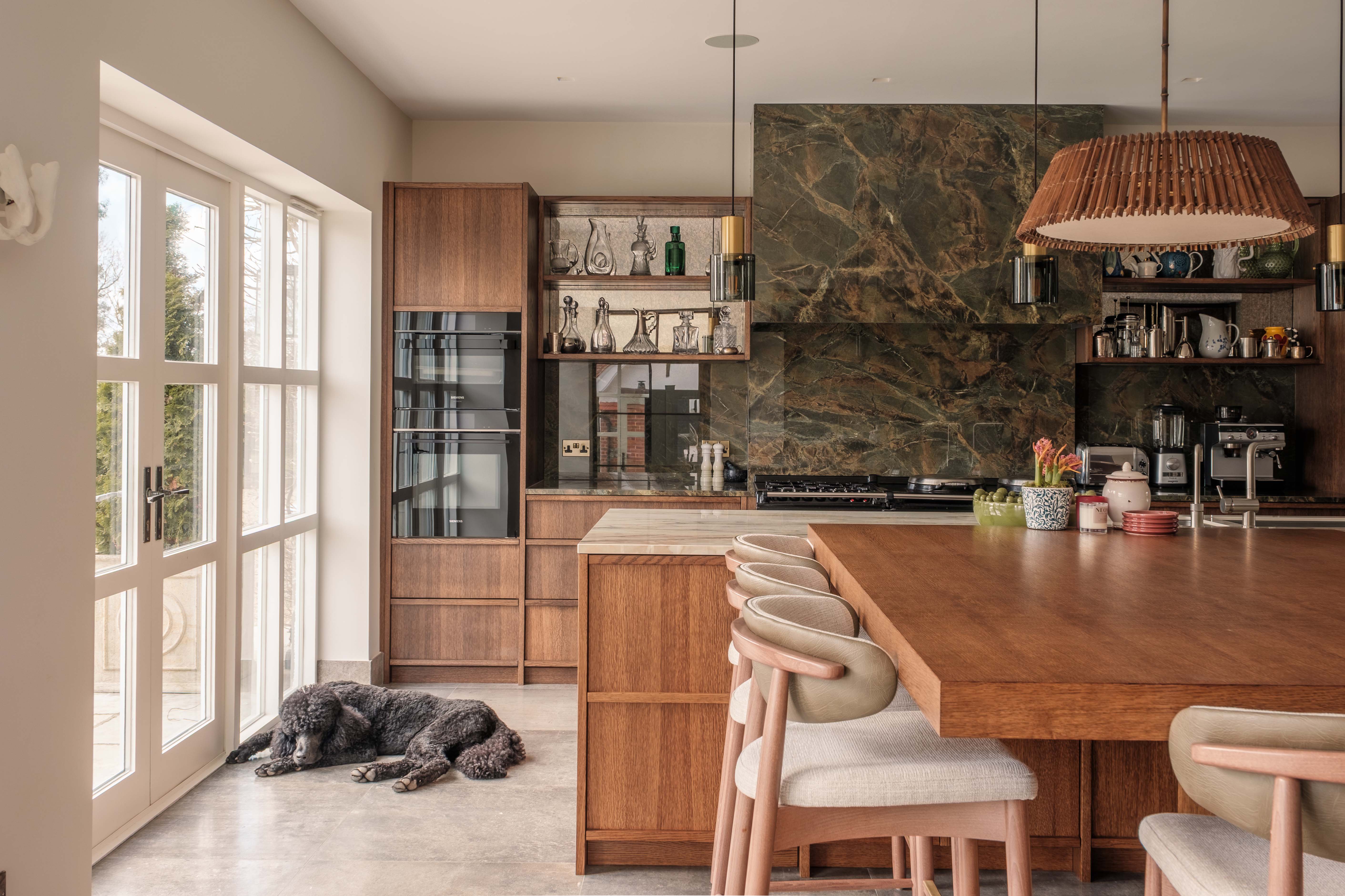 The island is long and sociable (just how we like it), with bar seating for six. This is a home for an active family, dogs and all, who love to entertain; we planned the kitchen for exactly that. We love how the doors open directly onto the garden, and as the day moves through the space, the light shifts with it: morning across the worktop, afternoon deep in the grain of the wood, the whole room changing mood without changing character.