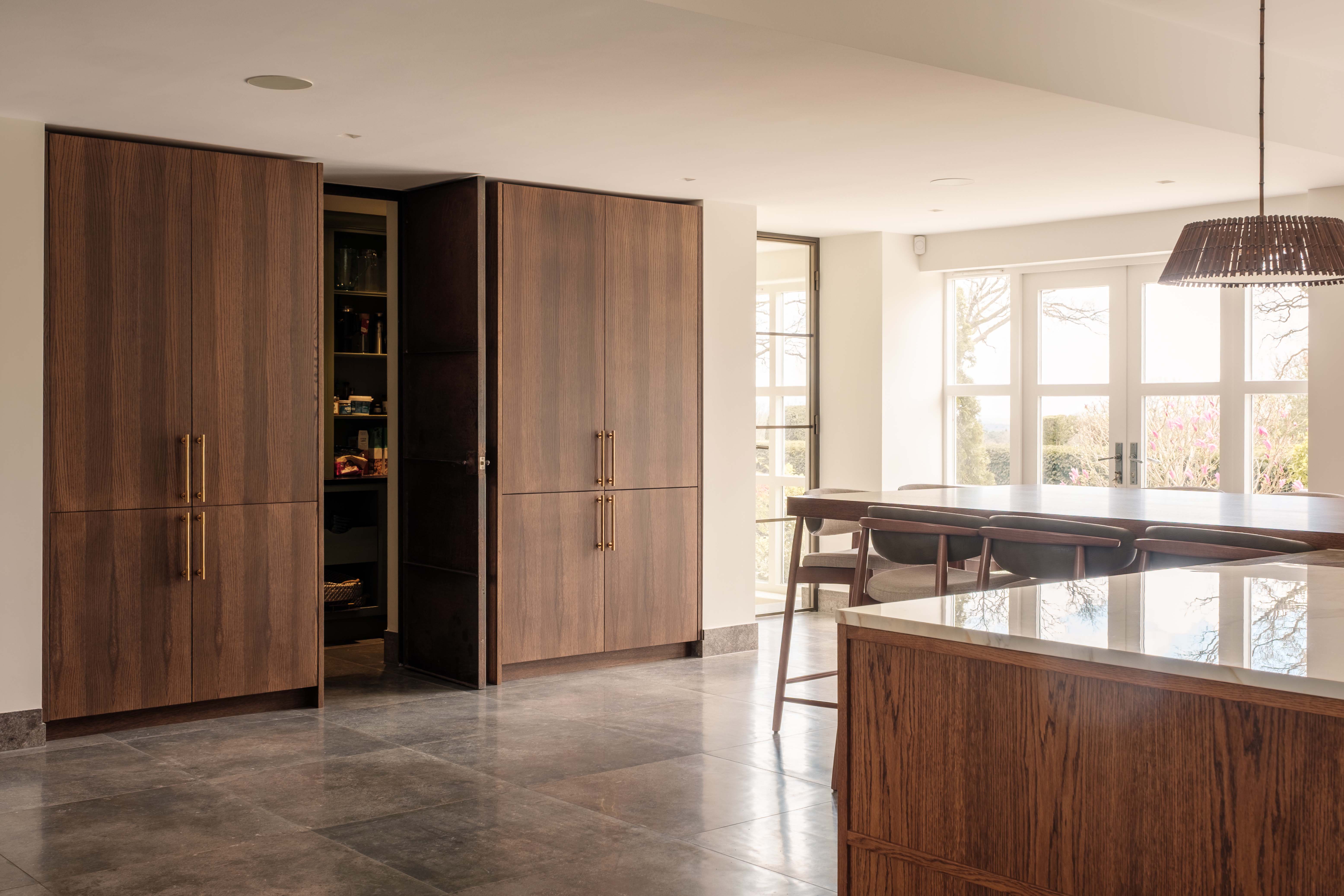 The cabinetry is hand-finished in one of our deeper oak stains; rich and warm, with a grain entirely its own. The full-height units along the back wall are striking, a treasure trove of storage, fitted with burnished brass hardware that catches the light beautifully.