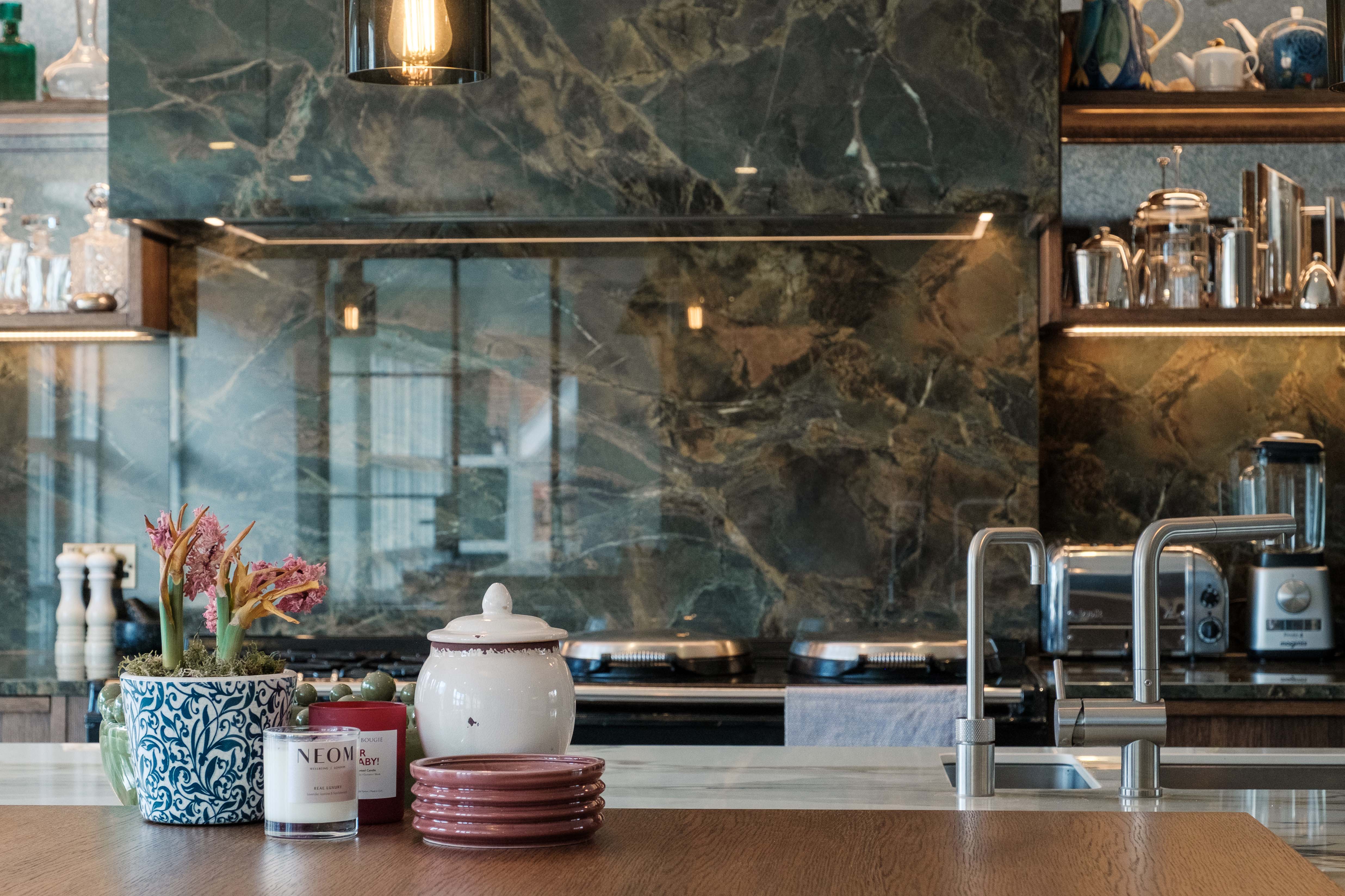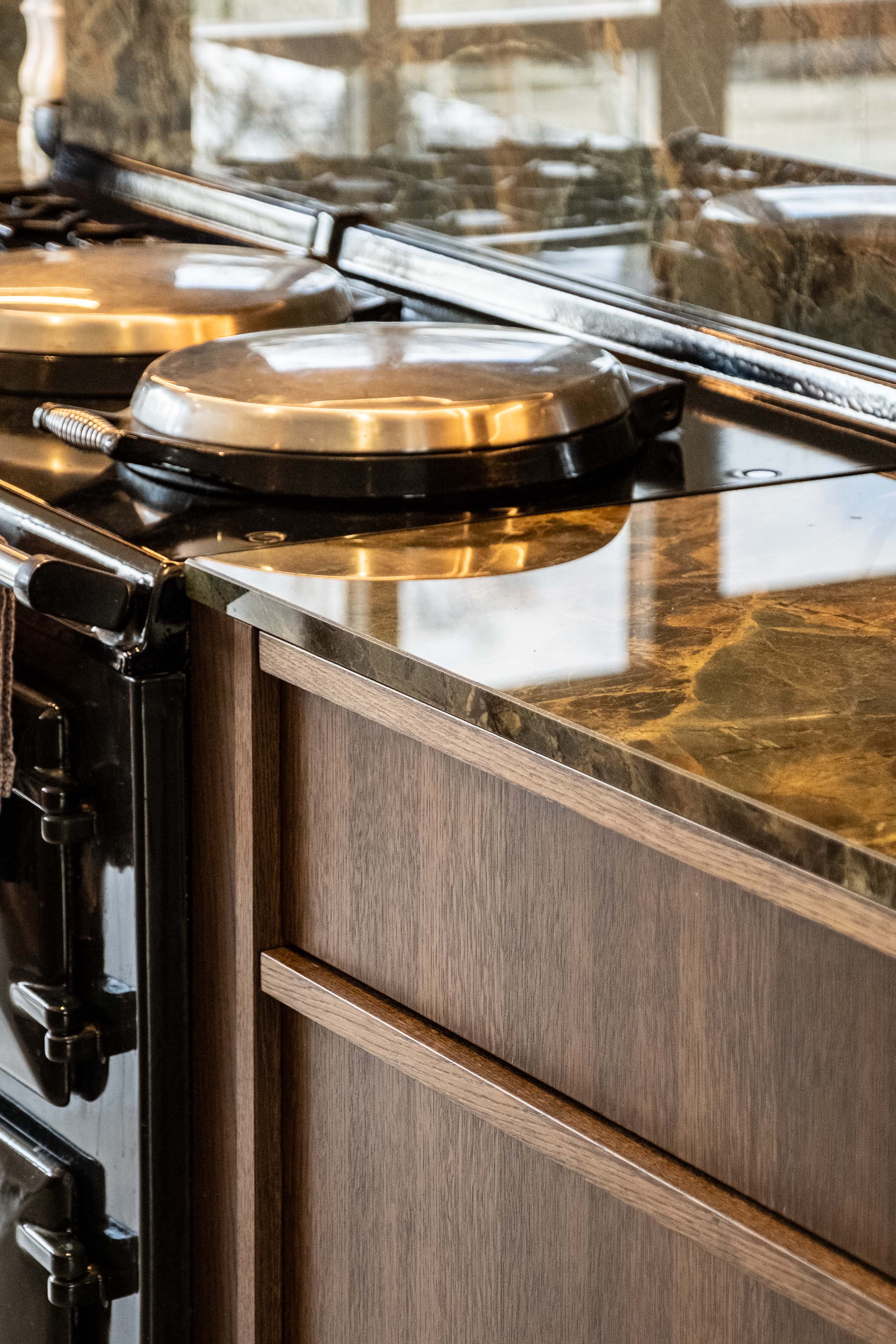 The porcelain brings a new energy and its own elegance: Marazzi Verde Borgogna around the Aga, Atlas Plan Calacatta Antique on the island surface, cool and veined and shot through with movement, together with the warmth of the wood.