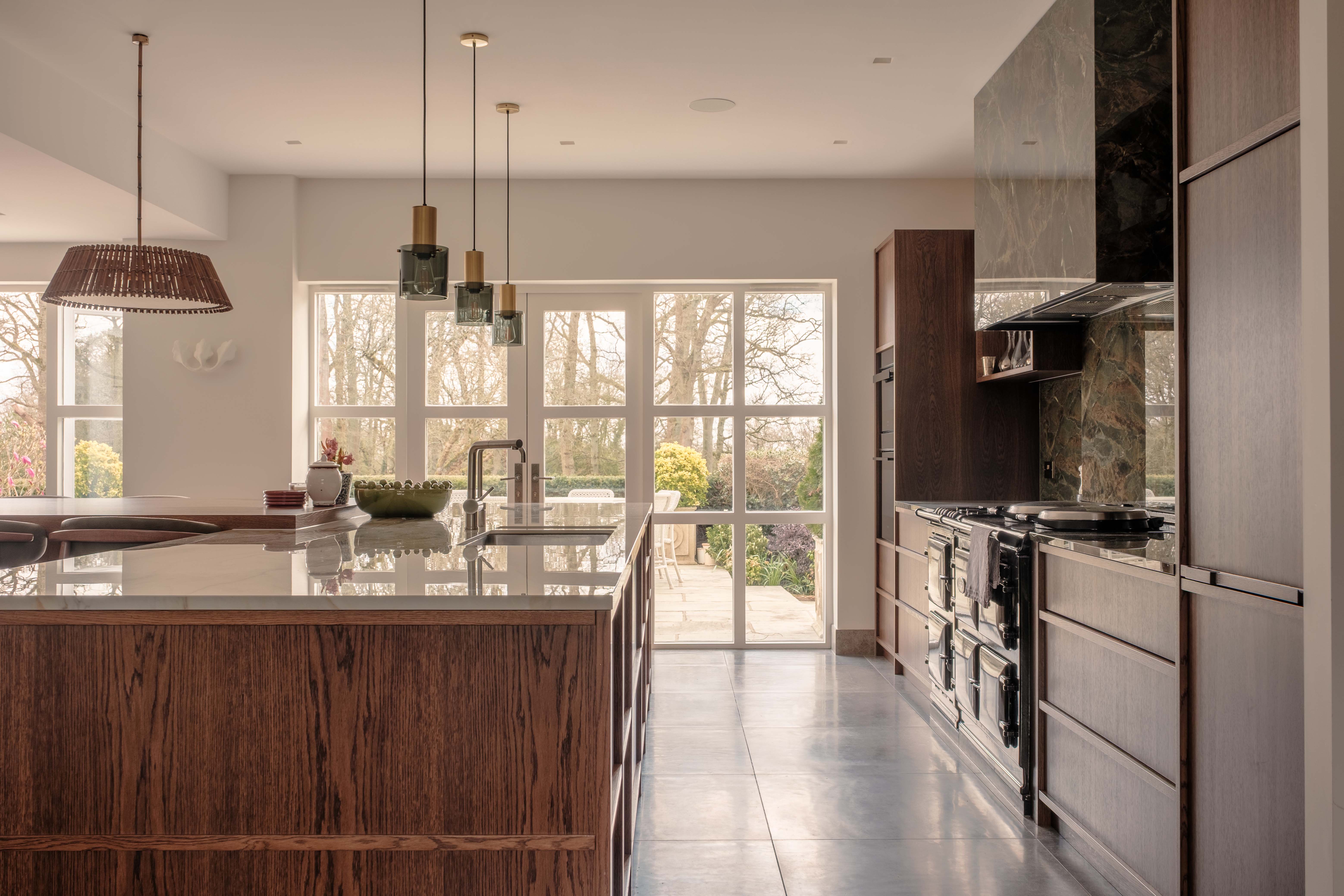 In a private home just outside Oxford, dark-stained oak and veined porcelain meet across a generous open-plan kitchen: two materials with depth and permanence, in a very modern house.
