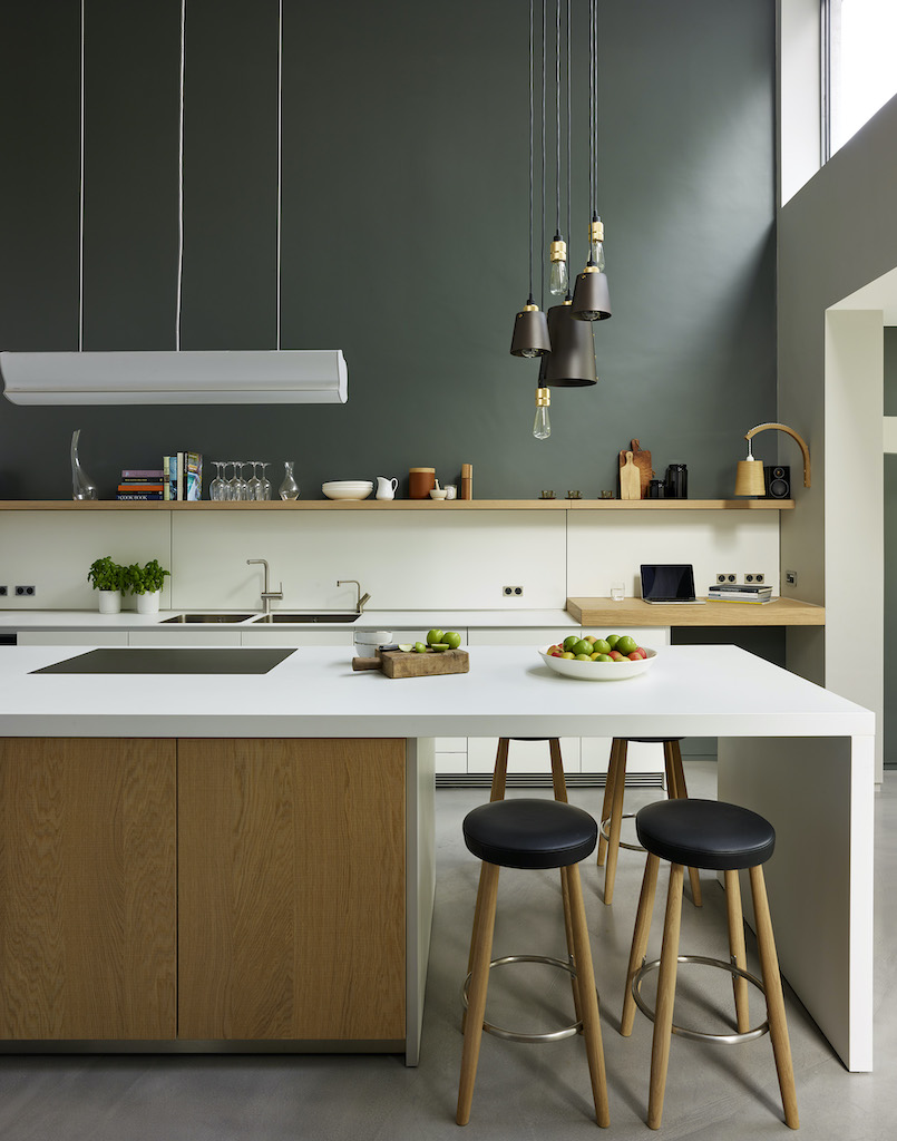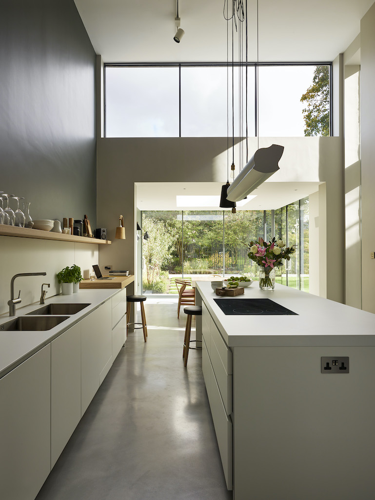 Improving the flow of this large Victorian house with a side extension built in the 1980s was the main aim of this project and the kitchen needed to be orientated around modern family life. The island is the main preparation and cooking zone in the room, with a bridge at one end for the bar stools in an entertaining area for guests. A simple shelf is positioned above the splashback and can be used by the owners to display their favourite accessories, such as glassware, artwork or recipe books. The extraction above the island posed one of the challenges in this kitchen because of the extra high ceiling, however an elegant recirculating model, hung on long fine cables, was chosen as an efficient solution that doesn’t look too heavy or block out the light.