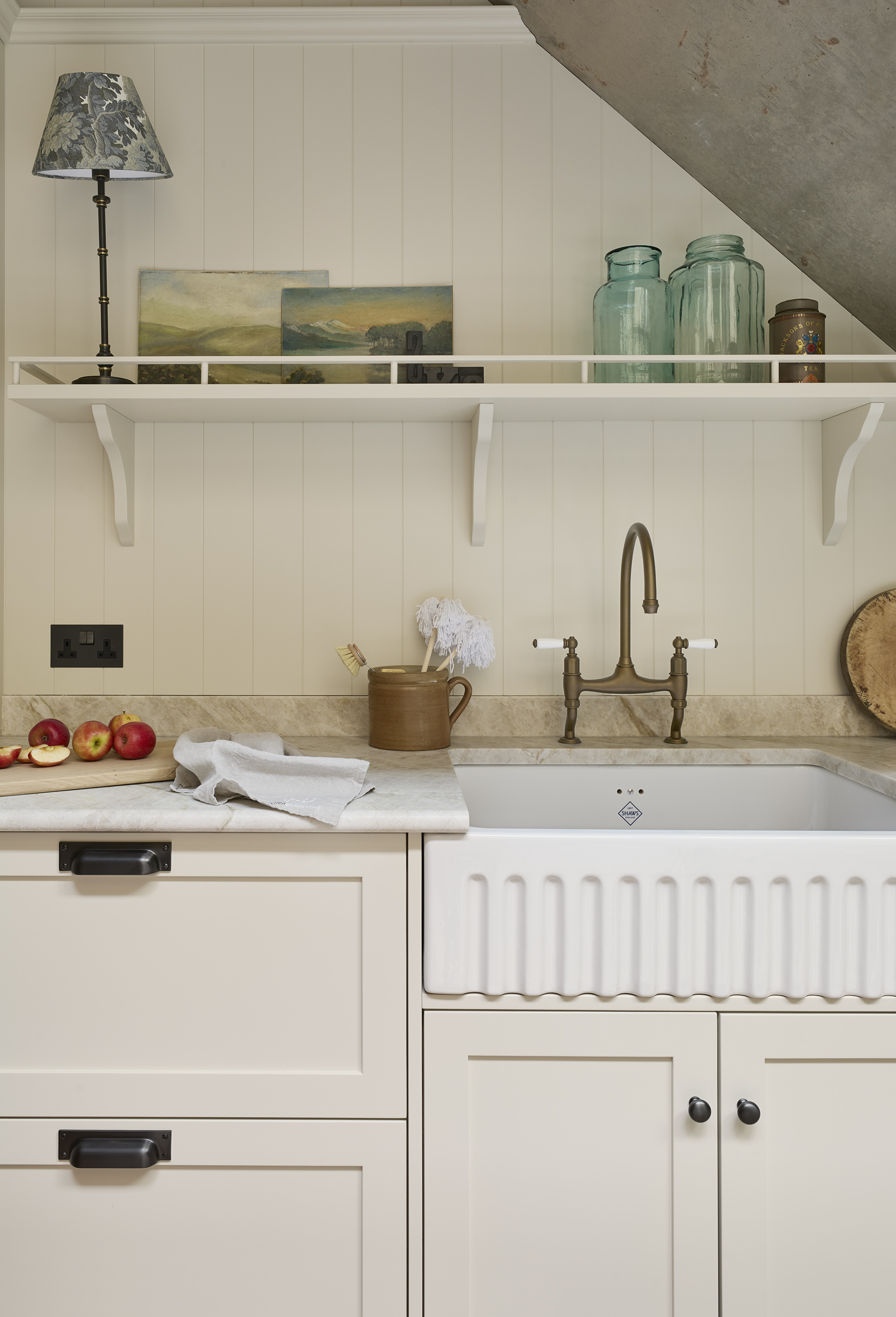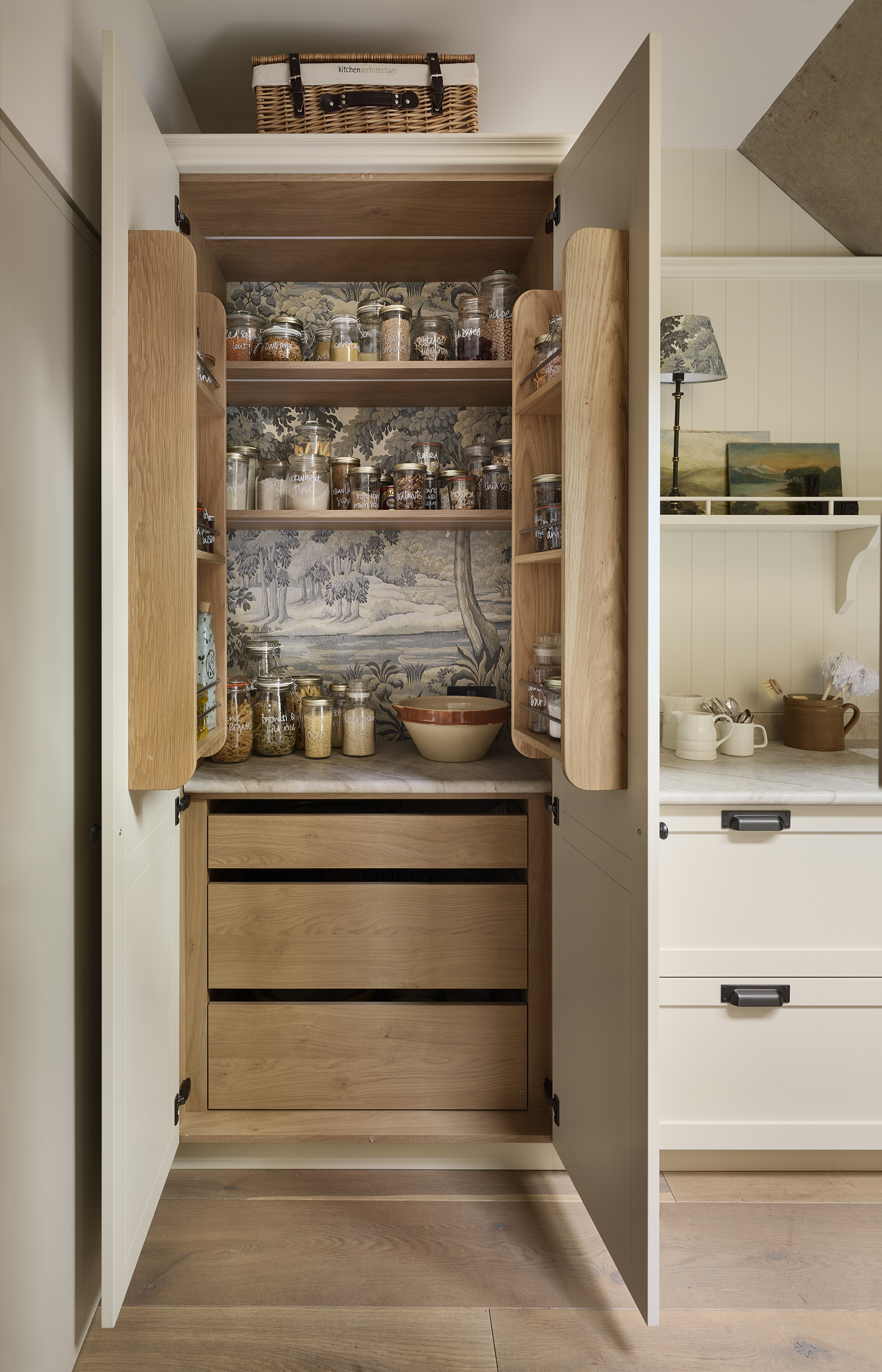 Contrasting materials, from traditional stone, wood and metal to contemporary use of glass and concrete, work harmoniously together to prove that period buildings are conducive to modern living. The versatility and timeless beauty of the handcrafted Teddy Edwards cabinetry and furniture is revealed when you take a closer look to appreciate the time-served solid wood construction and the meticulous attention to detail, from the hand-painted finishes and the beautiful, hardwearing work surfaces through to the carefully chosen cabinet handles and bespoke organised wine storage.