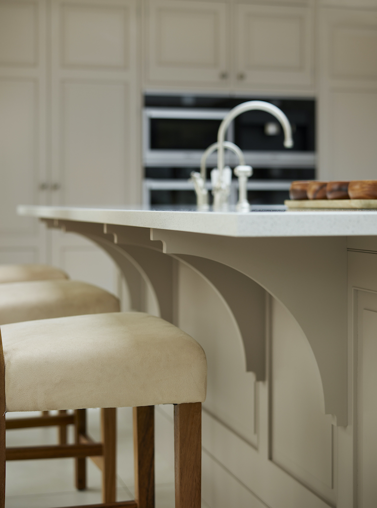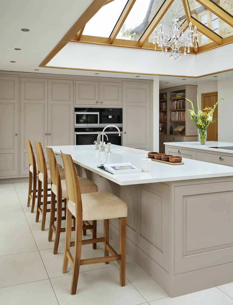 Paralleled islands add a pleasing symmetry and provide copious amounts of worktop space and sociable seating with an overhanging breakfast bar. High gloss-effect surfaces not only have a luxurious appeal but are durable too. The Shaker-style furniture has tried-and-tested detailing and the floor-to-ceiling cabinets along one wall feature integrated Miele cooking appliances and a built-in coffee machine. An entertaining lifestyle is complete with a wine cooler and surrounding bottle storage.